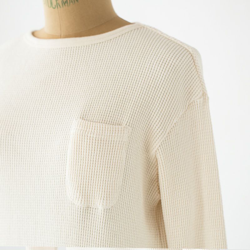 適度な厚みがあり、着伸びしないワッフル。一枚着で気になる透け感もなく、レディースアイテムながらどこか無骨なかっこよさも兼ね備えた生地です。