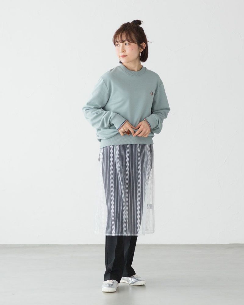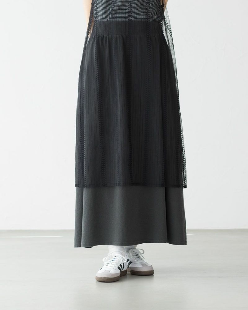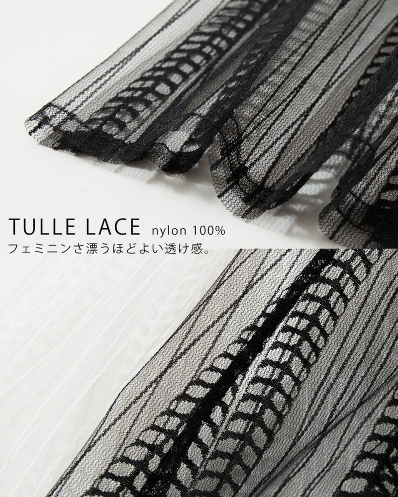 動くたびにふわっと揺れるチュールレース生地。繊細なストライプ柄でさりげない着痩せ効果も。