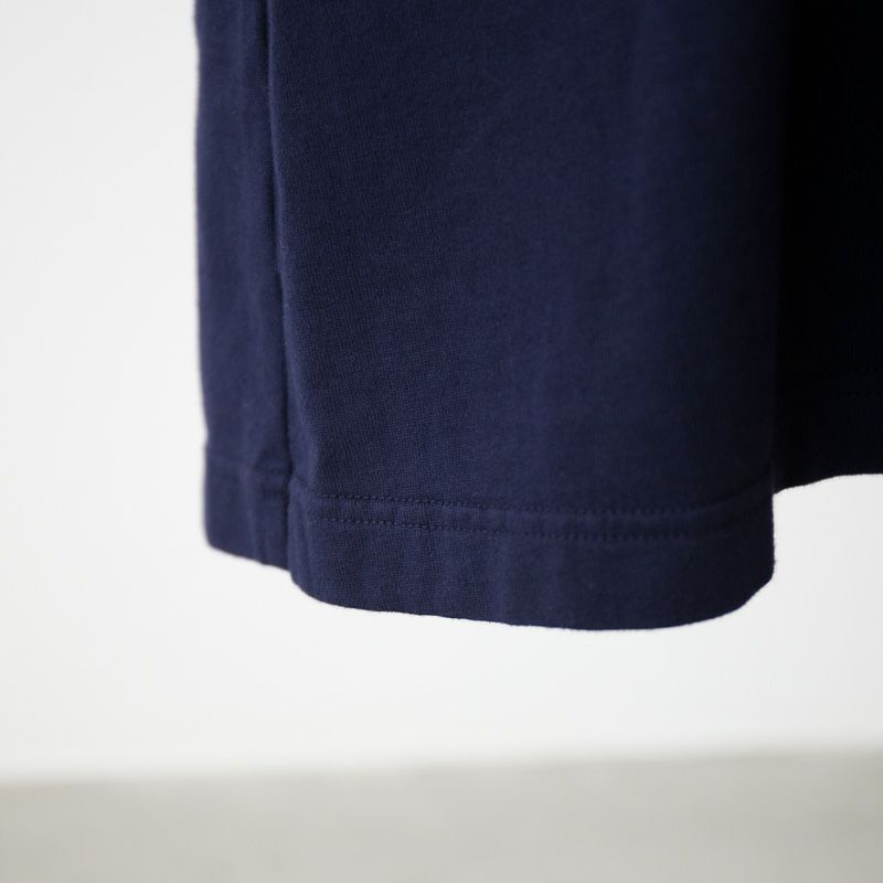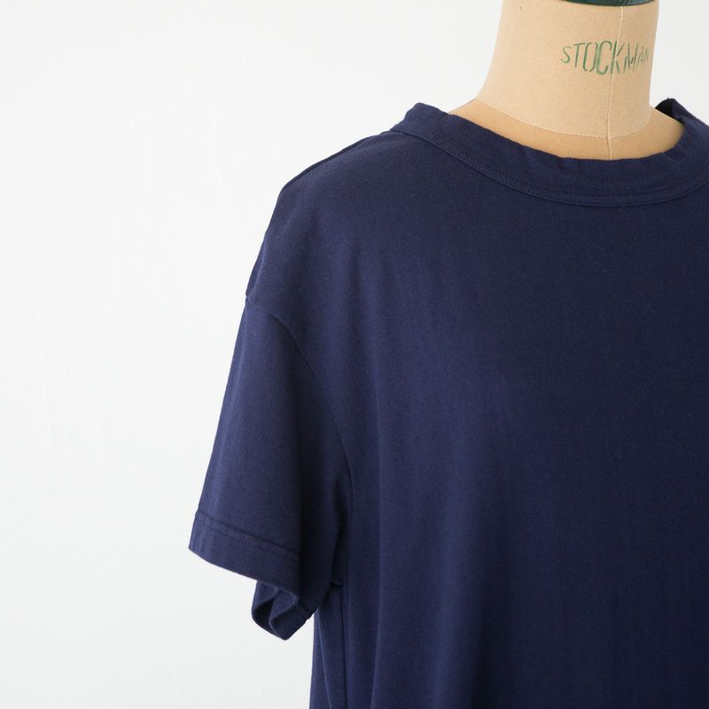 表面には綺麗に染まり張りコシがある綿糸を、肌に触れる内側には綿本来の柔らかさを引き出した「熟成コットン」を使用。 しっかりと目を詰めながらも、柔らかさと弾力を損なわない、吊り編みならでは風合いを味わえる度詰め天竺です。 密度が高く適度な厚みがあるため、型崩れしにくいのも特長。共布使いのバインダーネックもデザインのポイント。