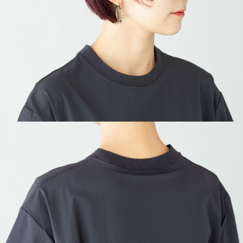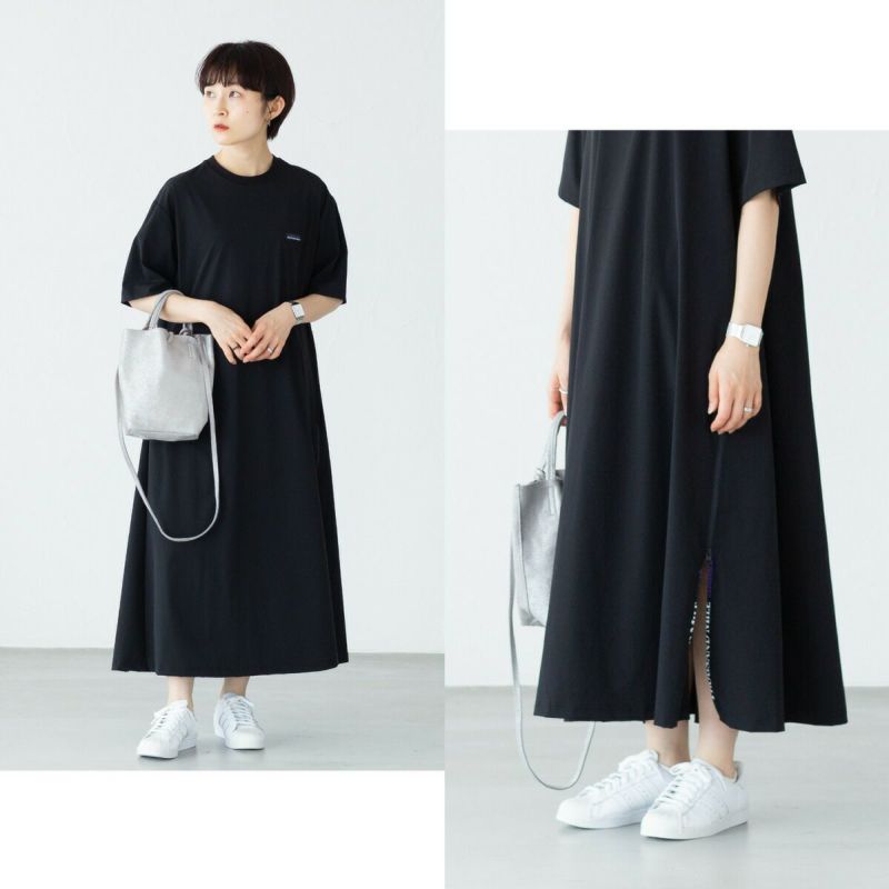 すぽっとシンプルに楽に着れるデザインで、左裾サイドにはブランドロゴデザインのジップ付き。サイドポケット下までスリットを作れるので、下にパンツをレイヤードして見せてもかわいい♪小物や靴の合わせ方次第でいろんな場面で着こなせる万能ワンピースです。