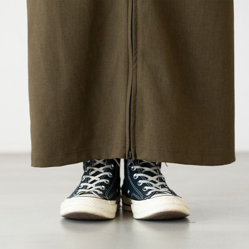 ウエスト部分はゴム仕様になっているので着心地楽チン。広がりすぎずストンとしたシルエットで着痩せ効果も◎。前はダブルジップ仕様で上下開け閉め可能、後ろスリット入りで足さばきもよくアクティブに動きやすいアイテムです。