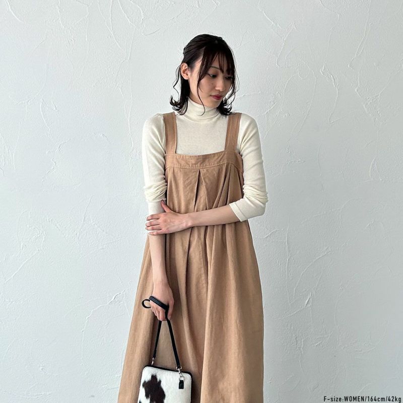 ざっくりとした綿麻の生地を使用し、麻特有のムラ感のあるファブリックで仕立てたロング丈のジャンパースカート。秋冬はニット、春夏は軽めのインナーに合わせて通年使えるアイテム。 裾の分量をたっぷり取ったAラインで女性らしいシルエットに。肩ひもを長く垂らしたバックデザインで後ろ姿も楽しめます。 肩ひもは長さ調節も可能ですので、どなたでも自分サイズに着用できます。