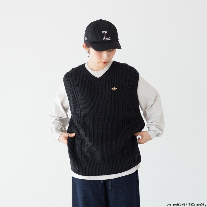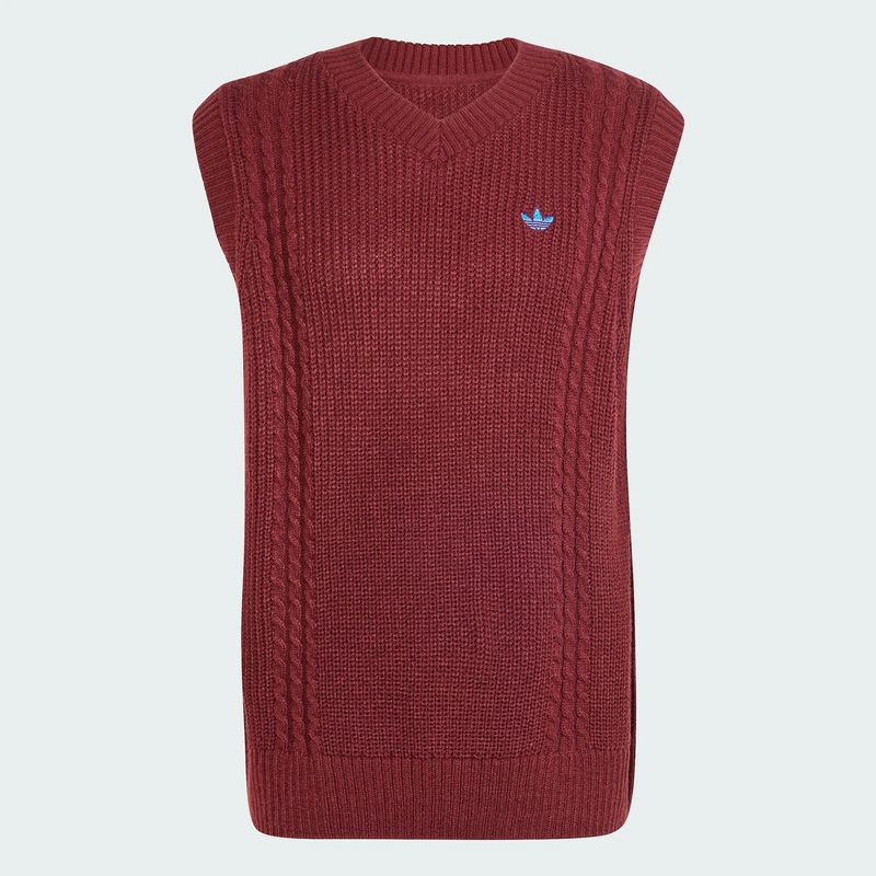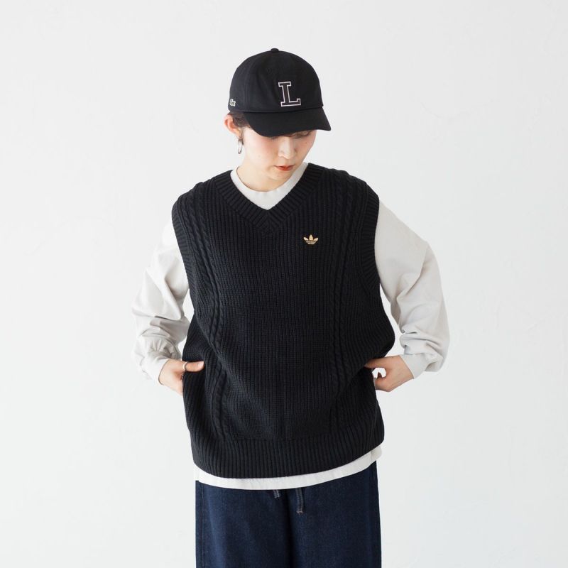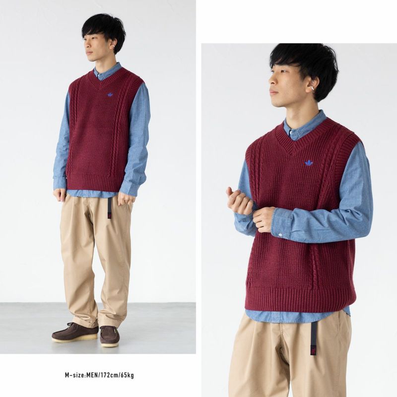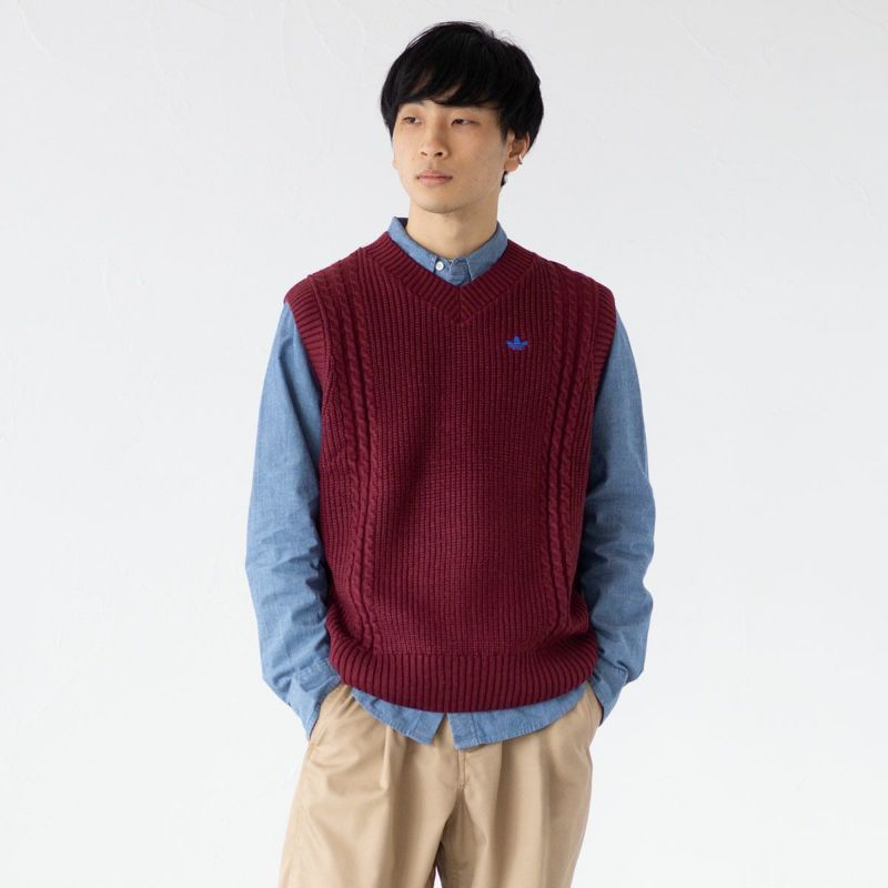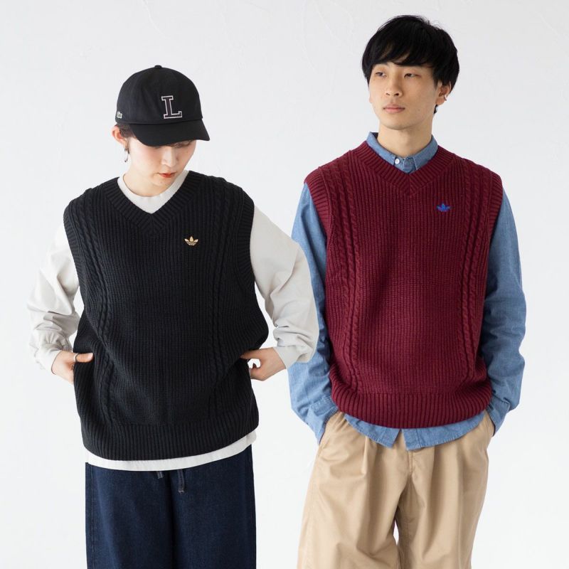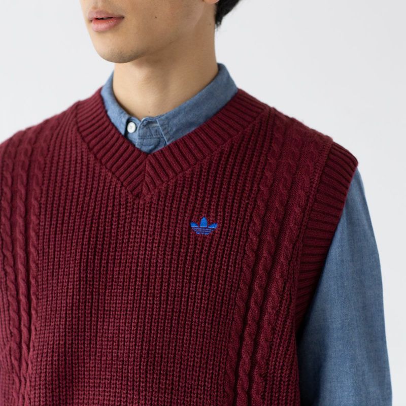 70年代に登山服として注目されたセーターを参考にデザインされたという、やや厚手のニットベスト。アディダス70'sシリーズの特徴的な配色はそのままに、ジャカードニットでクラシカルな雰囲気に仕上げています。