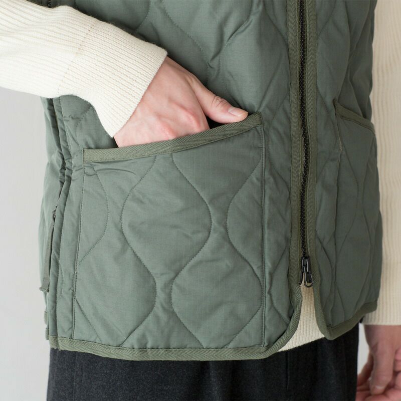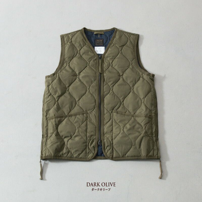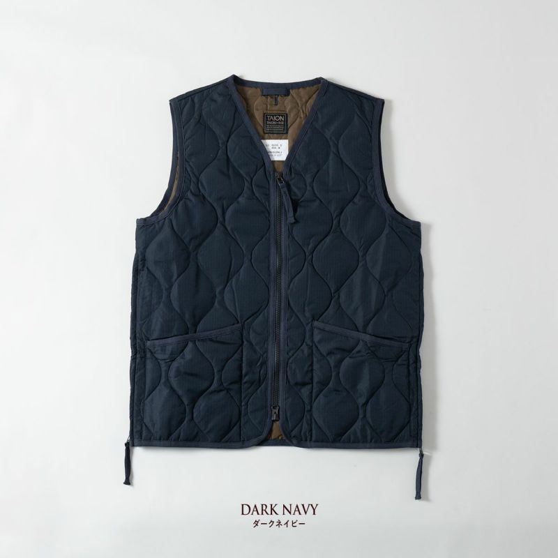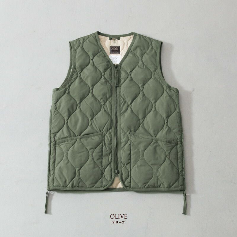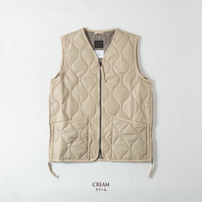 話題沸騰のダウンウェアブランド「TAION」のミリタリーVネックWジップダウンべスト。