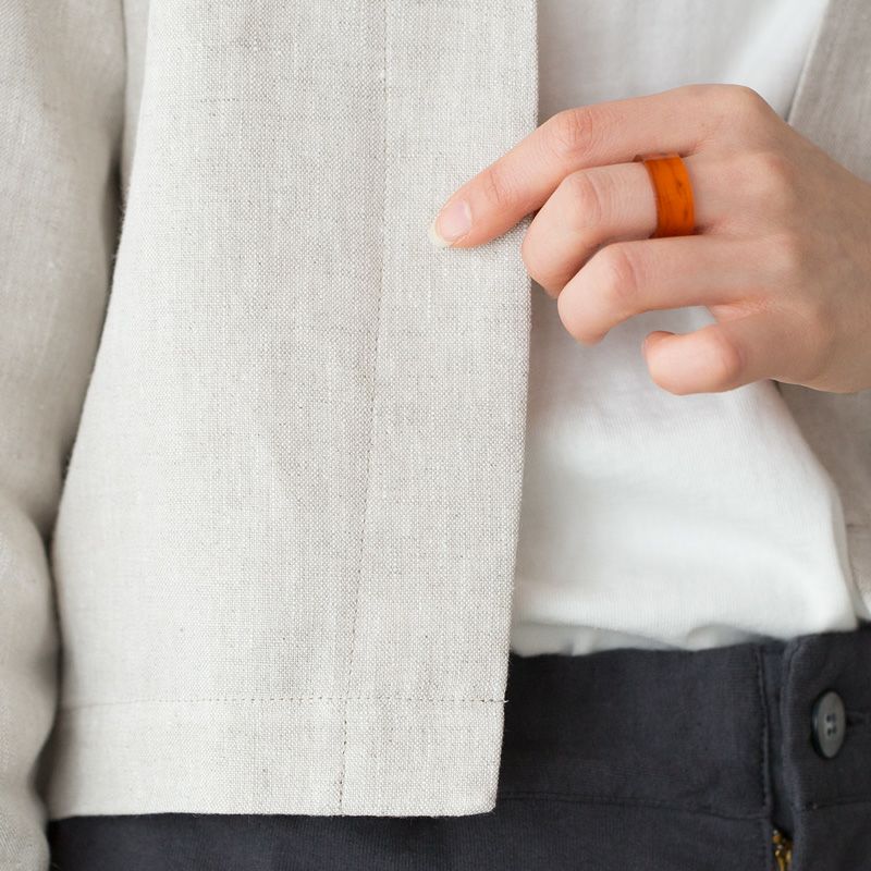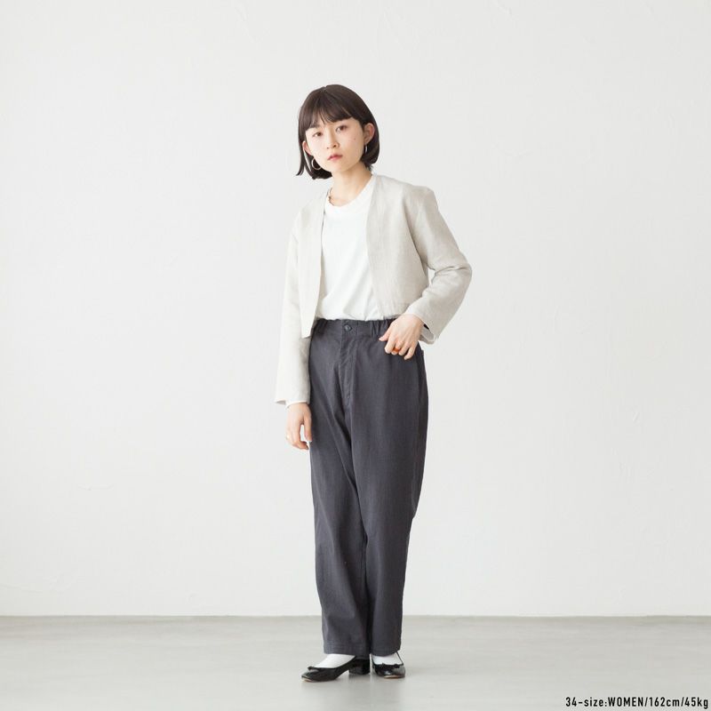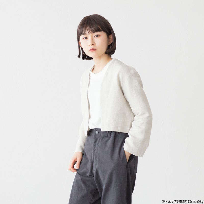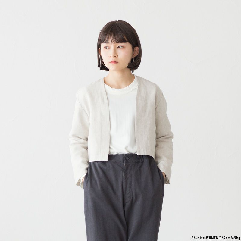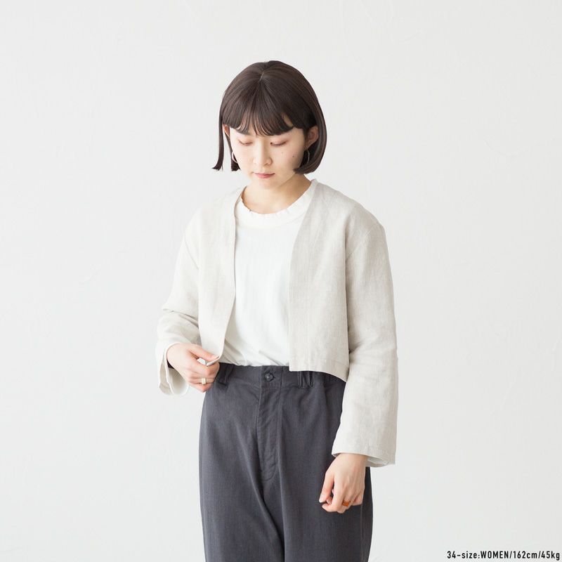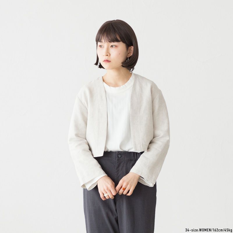春夏大活躍する、リネン100%のシンプルノーカラージャケット。
