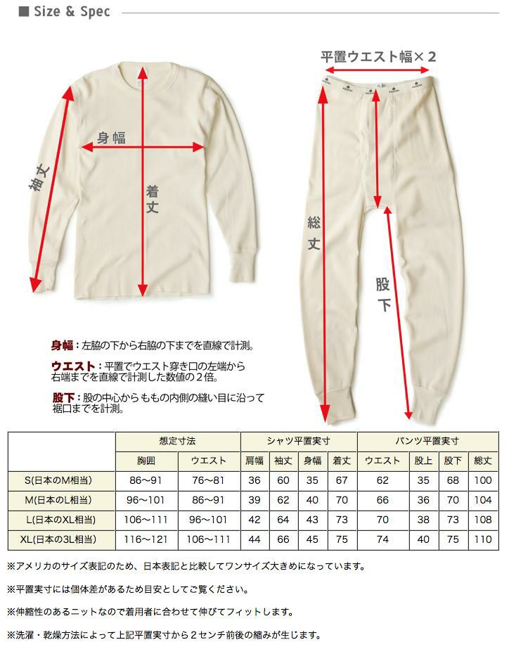 ※洗濯・乾燥方法によって上記平置実寸から2センチ前後の縮みが生じます。