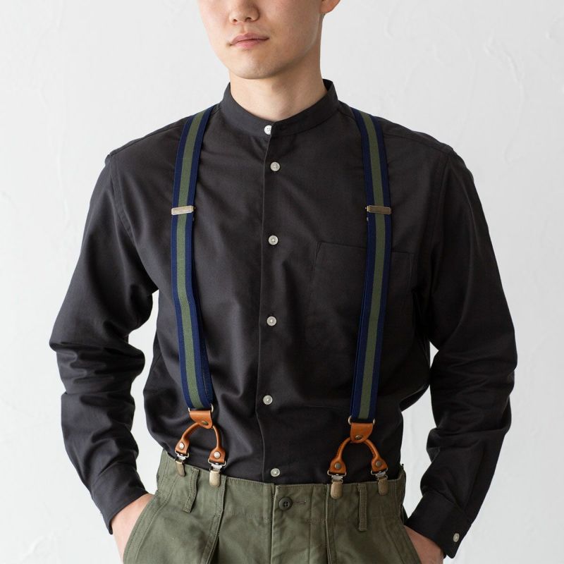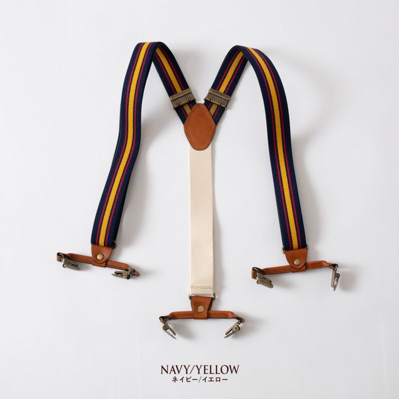 こなれ感のあるアイビースタイルを演出できる、D.C.WHITEのストライプ柄サスペンダー。鈍く光るアンティークゴールドのメタルパーツ、経年変化を楽しめる本革のレザーパーツで構成されたクラシカルなルックスです。