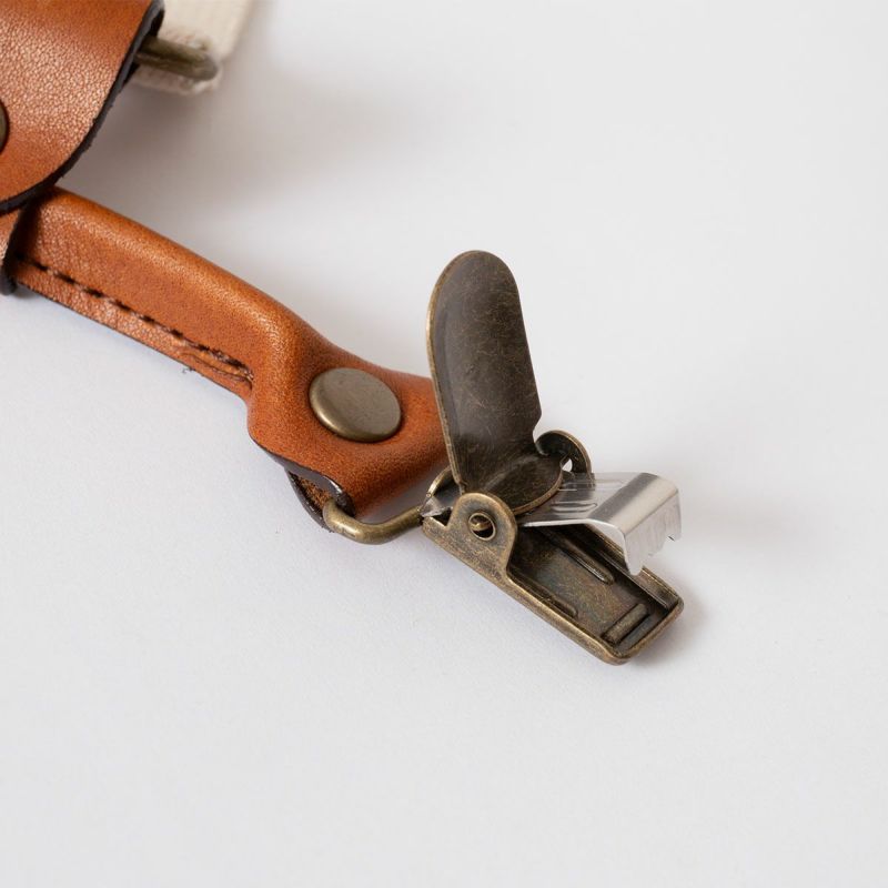 留め具はサスペンダーボタンのないパンツにも装着できるクリップ式、各所2又固定でパンツをしっかりと固定します。背中のレザーパッチには D.C.WHITEのロゴ刻印入りです。
