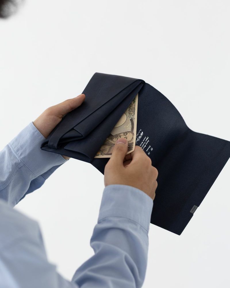 日本特有の美しい立ちふるまい「所作」の中で、感謝の心を表す「包む」の動作が自然に行える、三つ折りデザイン。