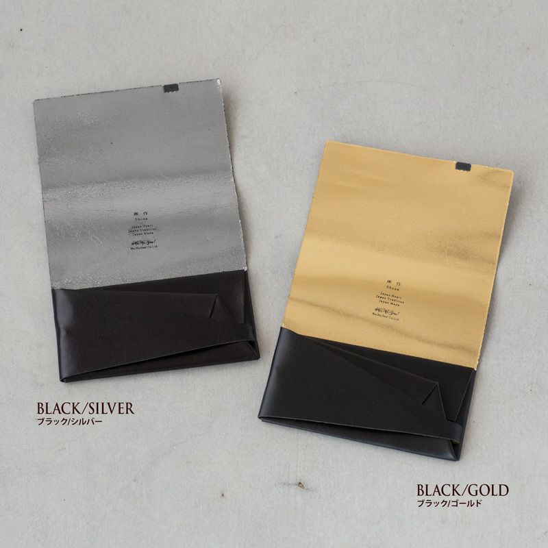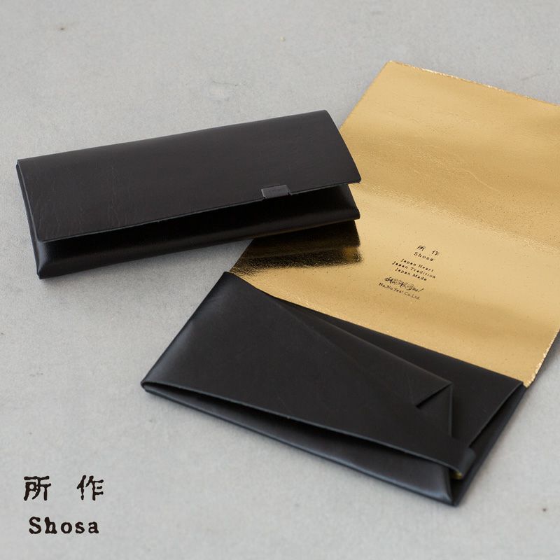 袱紗モチーフのレザー長財布、金銀箔加工モデル。