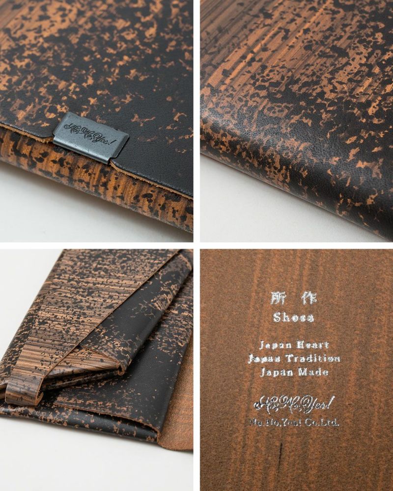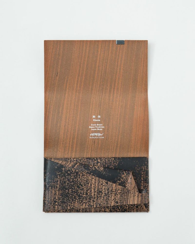 日本特有の美しい立ちふるまい「所作」の中で、感謝の心を表す「包む」の動作が自然に行える、優雅さを感じさせる三つ折りデザイン。全ての製品は兵庫県姫路城の南にあるアトリエで職人によってつくられています。