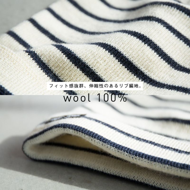 素材はウール100%。しっかりと目が詰まったミドルゲージの編み地でハリのある手触りです。伸縮性のあるリブ編地はフィット感が高く、フリーサイズに対応可能。