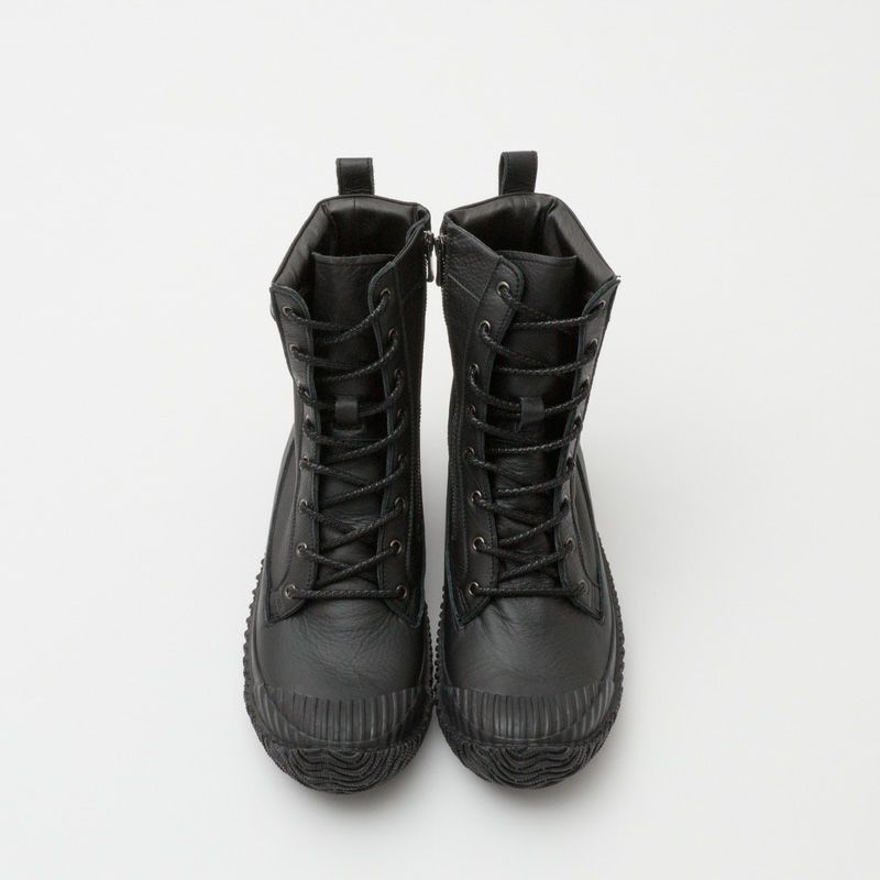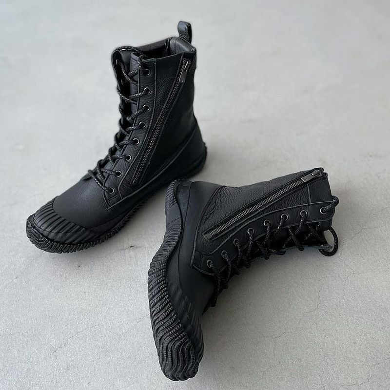 シボ入りとスムースの2種類の牛革を組み合わせたワーク&ミリタリーなレースアップブーツ。ストライプデザインのトゥキャップやリフレクターネームを採用し、アウトドアテイストな仕上がり。履き口にパッドが入っているので履き心地がよく、長めのファスナーで着脱のしやすさも追求しています。