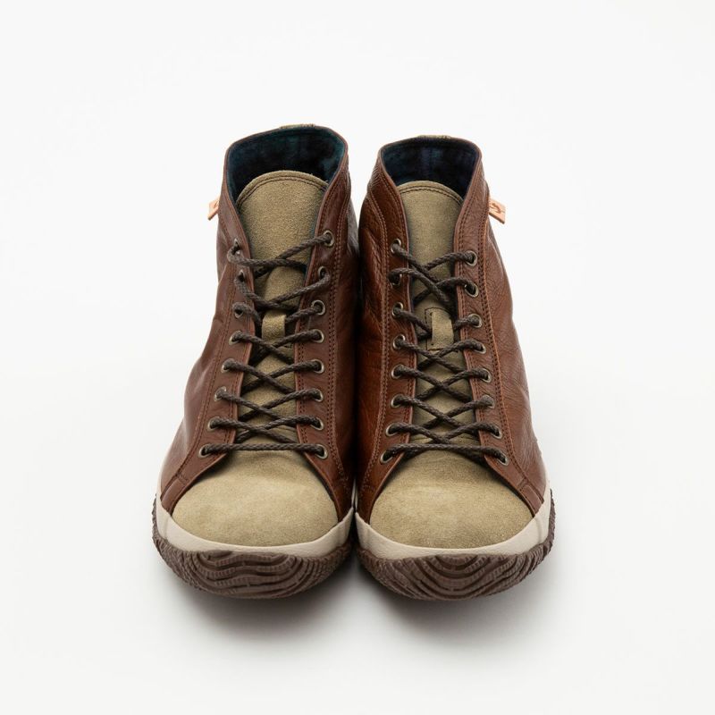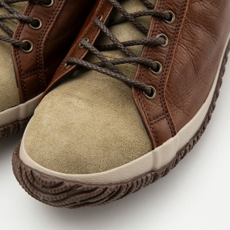 こちらは重厚感あるオイルワックスレザーと上質なスウェードをコンビ使いしたハイカット。オイルワックスレザーは油分を多く含んだ革で、定期的にレザークリームで油分を補給することで、より深くムラ感のある色味へ変化します。