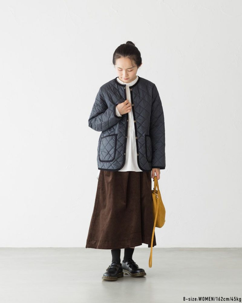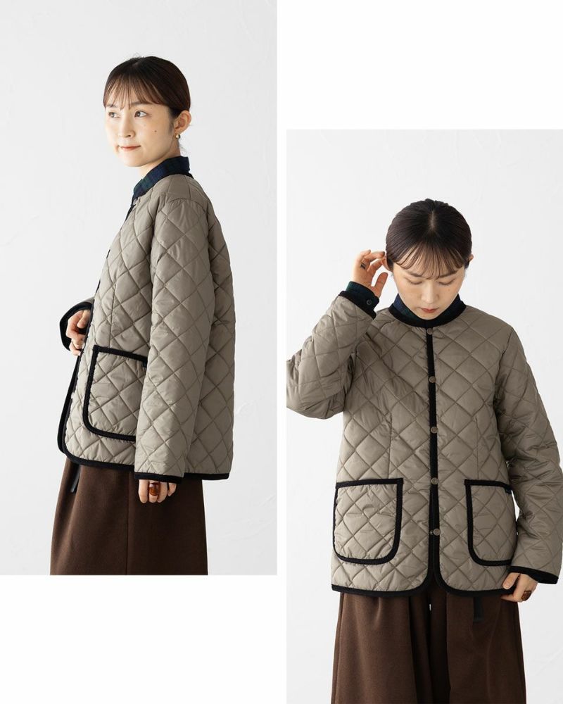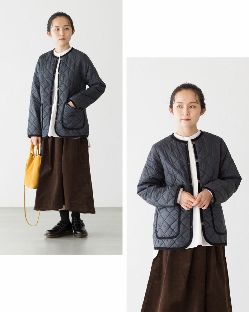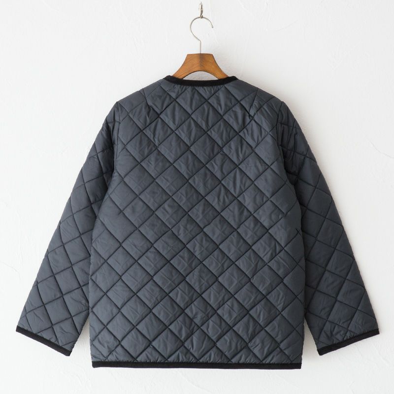 ブランドを象徴するダイヤモンドシルエットのキルティング生地を使用した「ラブンスター」生地は、適度な厚みがありつつしなやかで、柔らかな着心地。コーデュロイで縁取られたパッチポケットがアクセントとなっています。コンパクトな見た目とパキッとしすぎないブラックカラーにより、スカートやパンツなど合わせるボトムスを選びません。襟なしで首回りがスッキリしたデザインなので、襟付きシャツやブラウスの上に羽織ったりなどの着こなしもオススメです。