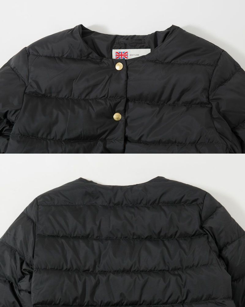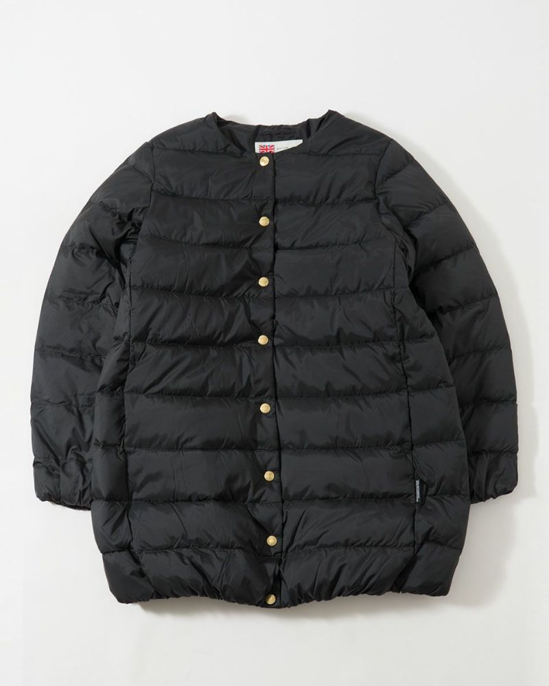 洗練されたボディに金ボタンをあしらった、英国ブランドらしい気品のあるルックスです。シャツやタートルネックとのレイヤードが映えるノーカラー仕様。