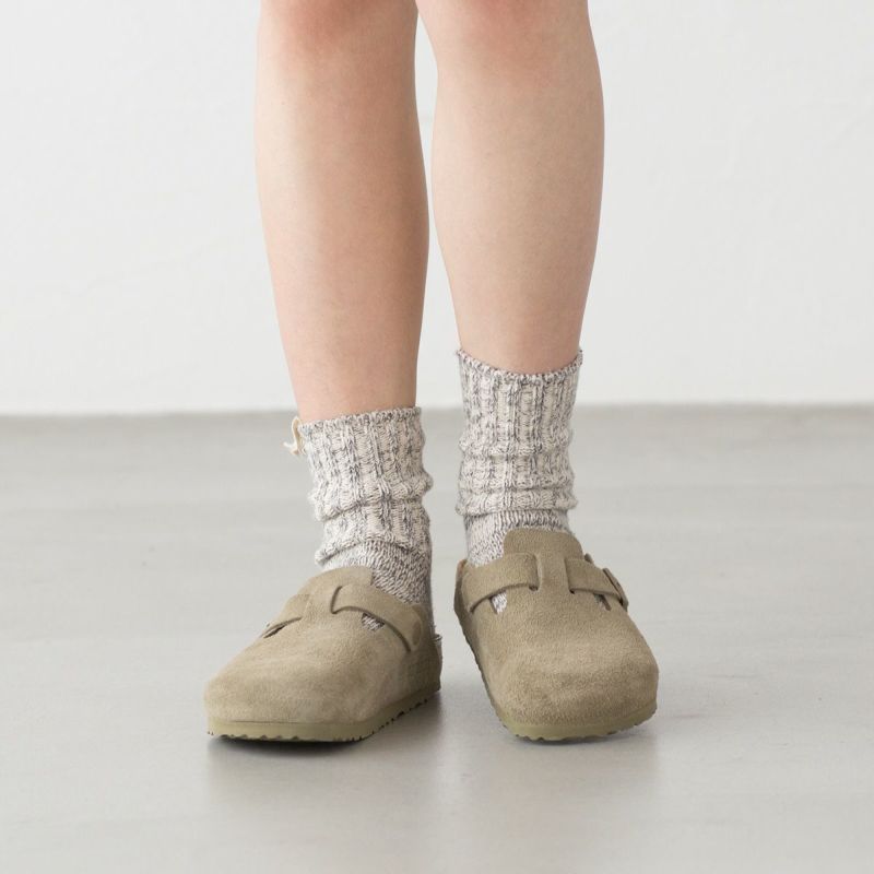 こちらソックスは撚りをかけず束にした無撚糸を、旧式の編機でゆっくりと時間をかけて編み上げました。