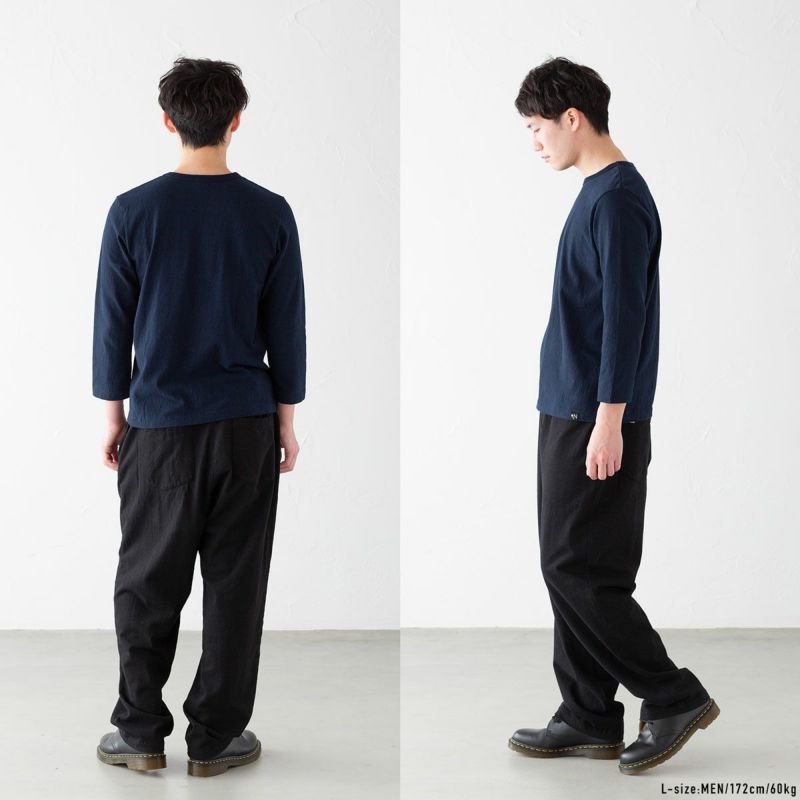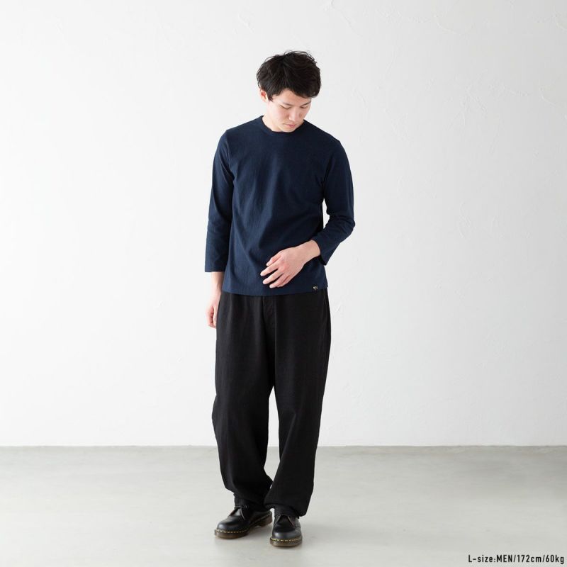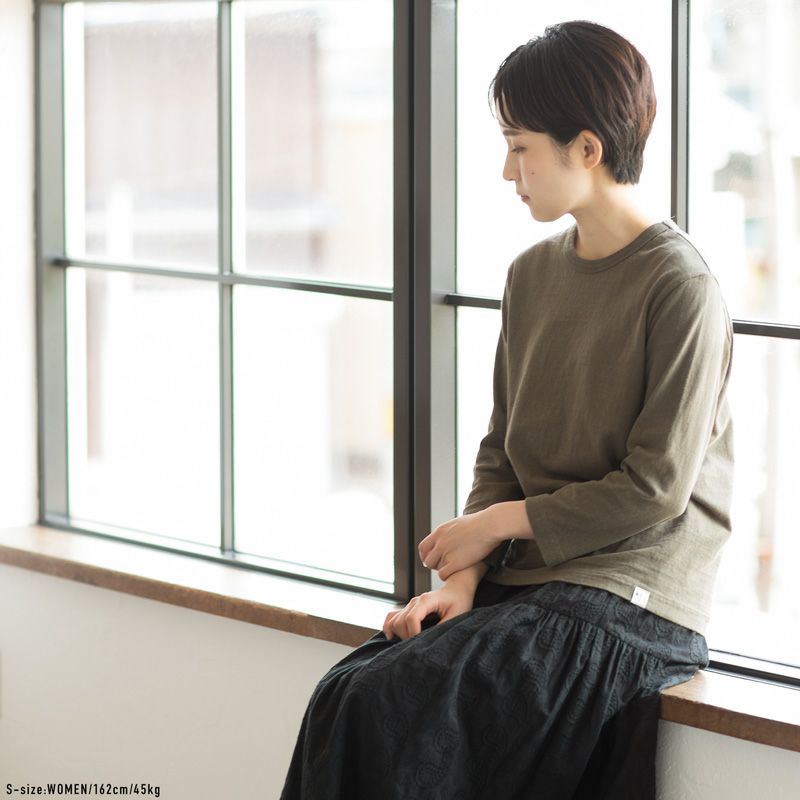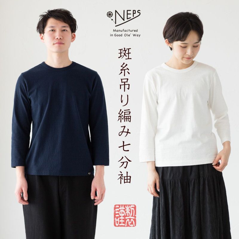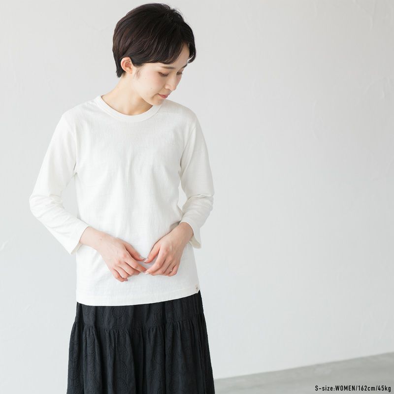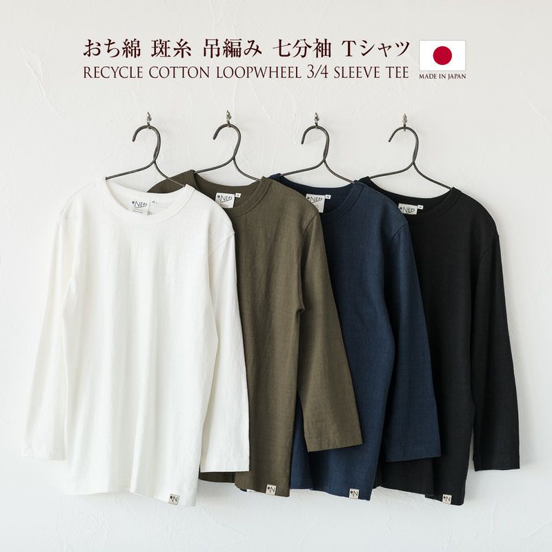おち綿(リサイクルコットン)の斑糸でさらりとナチュラルな風合いに仕立てた、ネップスの七分袖Tシャツ。