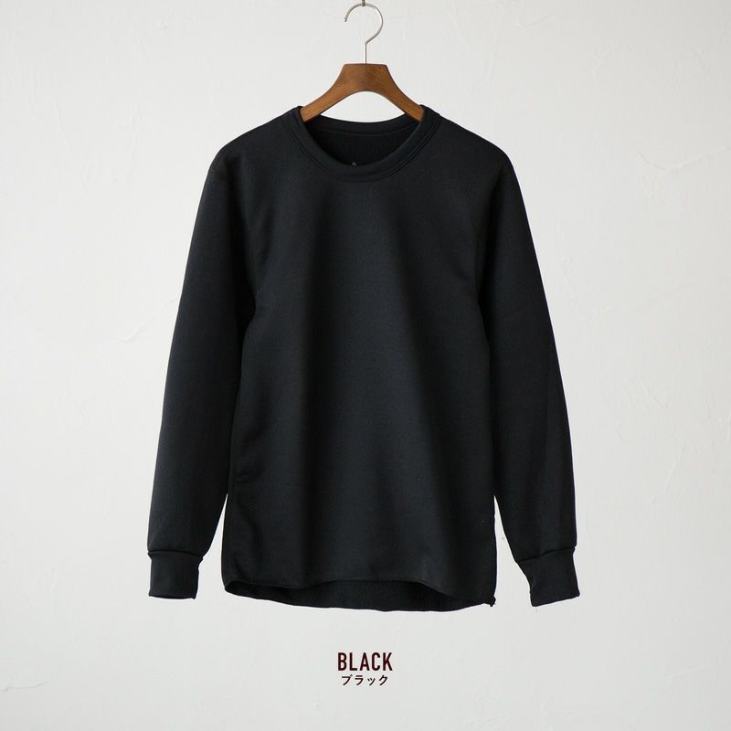 肌に触れる裏面は肌触りの気持ちいい柔らかな裏起毛加工。素肌に着るのはもちろん、スウェット感覚で肌着の上から着ても暖かく冬のデイリーウェアとして活躍します。