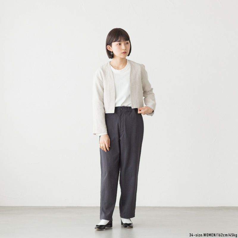 春夏大活躍する、リネン100%のシンプルノーカラージャケット。