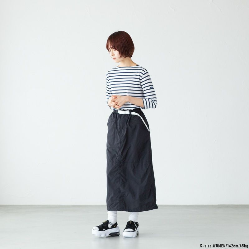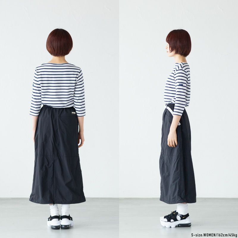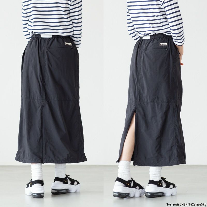 裾にはドローコード付きでセミフレアとバルーンシルエット2WAYで楽しめます。ストンとすっきり見えて使いやすいナイロンスカート、いかがでしょうか。