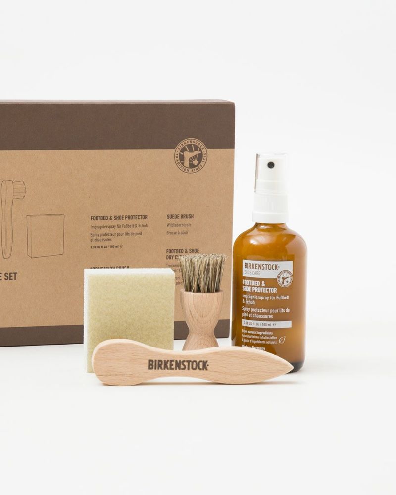 レザーを経年劣化から守るシュープロテクター&塗布用ブラシ、消しゴムタイプのフットベッド&靴用ドライクリーナー、汚れ落とし用のスウェードブラシがセットになったシューケアキット。