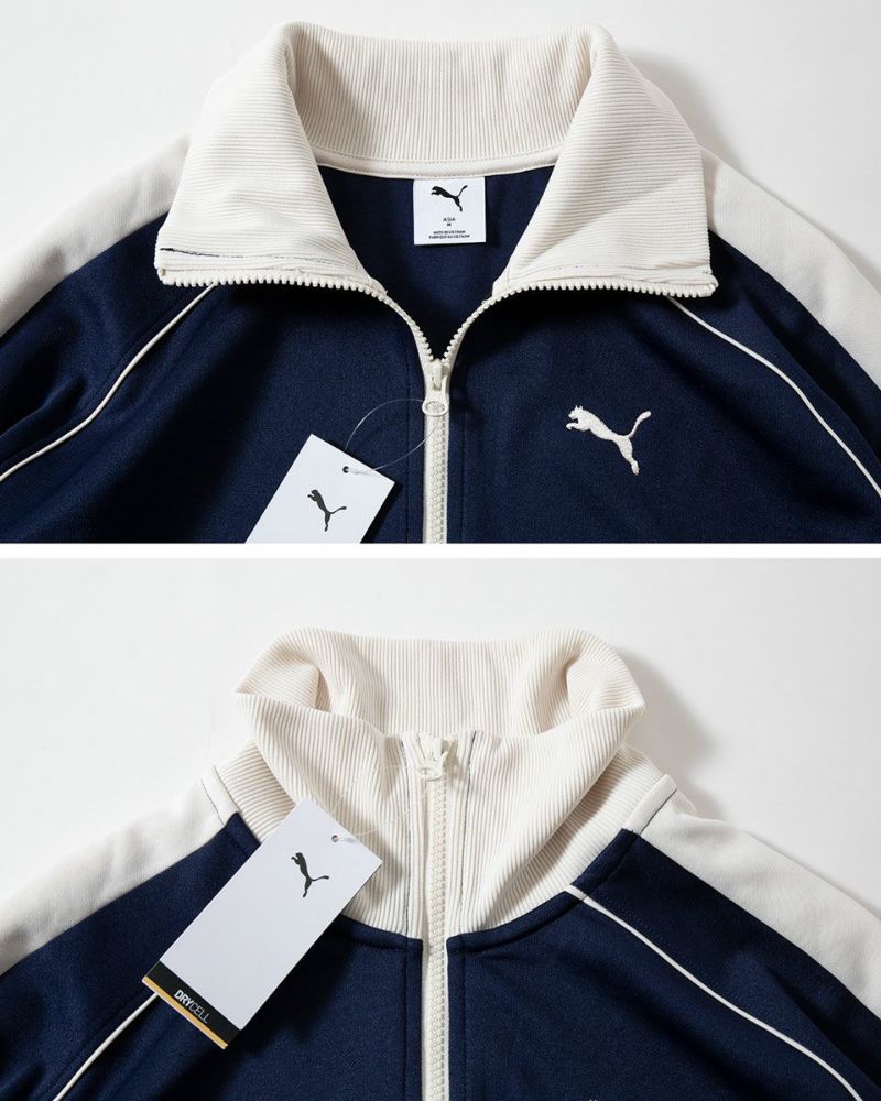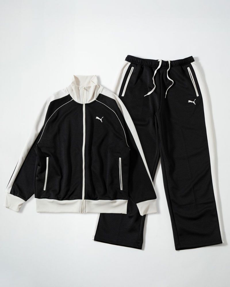 プーマが誇る名作ジャージT7より、日本人にマッチするサイズバランスで作られたトラックスーツ(上下組)が登場。レトロなスタイルを演出できるラグランスリーブ、オフホワイトで切り替えた各所のリブとトリミングがポイントです。
