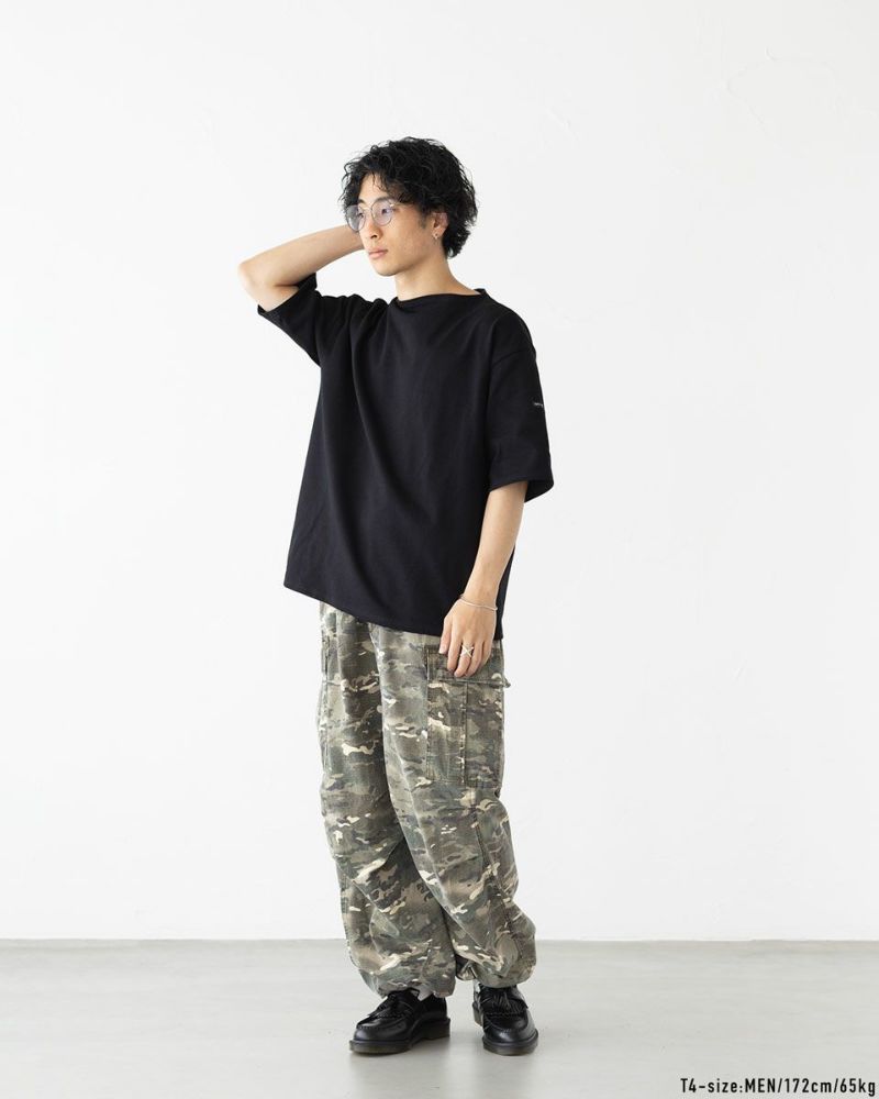 どんなボトムスとも合わせやすいボックスシルエット。女性向けのT1、T3サイズは着丈が長すぎず、トップスアウトの着方でもバランスが取りやすいデザイン。 T4サイズから上の大きいサイズは、着丈が長く設定されたメンズも着れるユニセックス規格です。