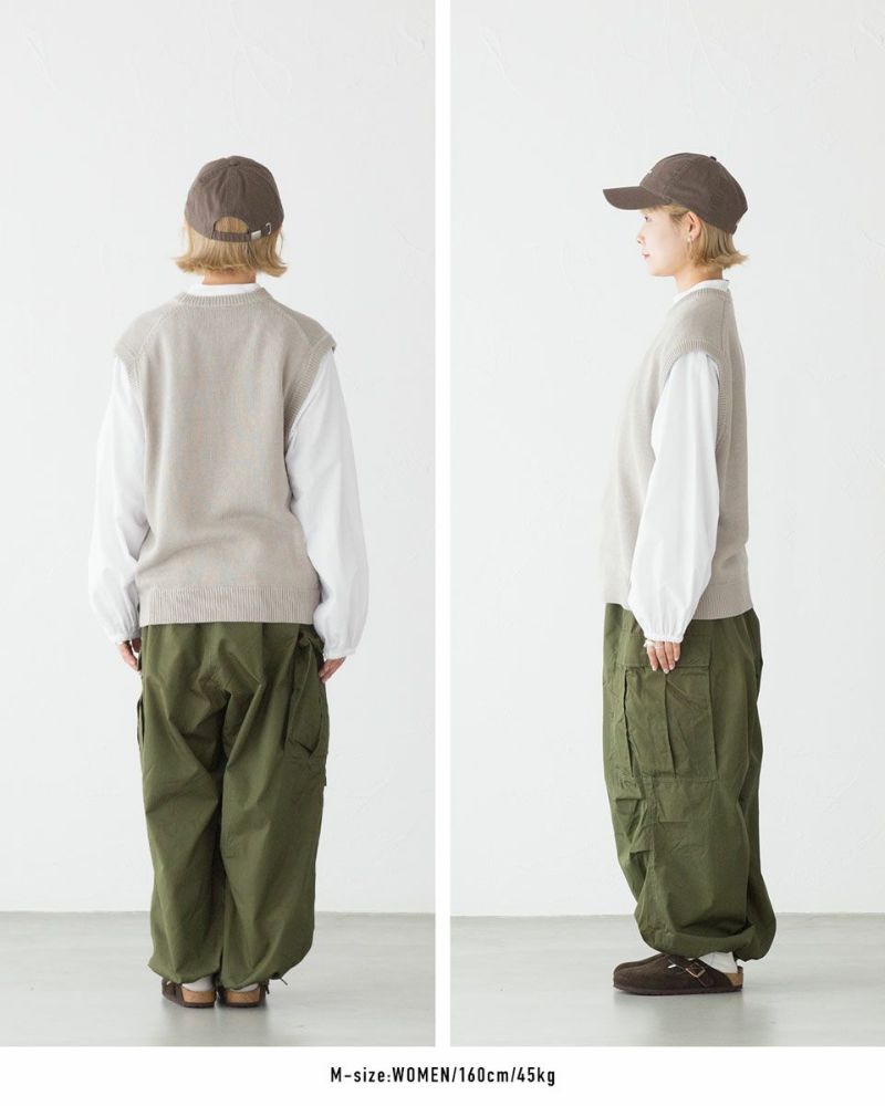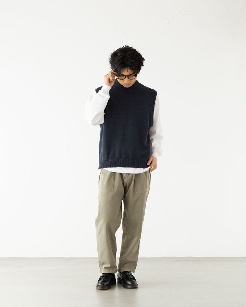 コットンとリネンの混紡素材で編まれたリラックス感のあるクルーネックのニットベスト。グラミチらしいナチュラルな色合いと素材感が魅力です。