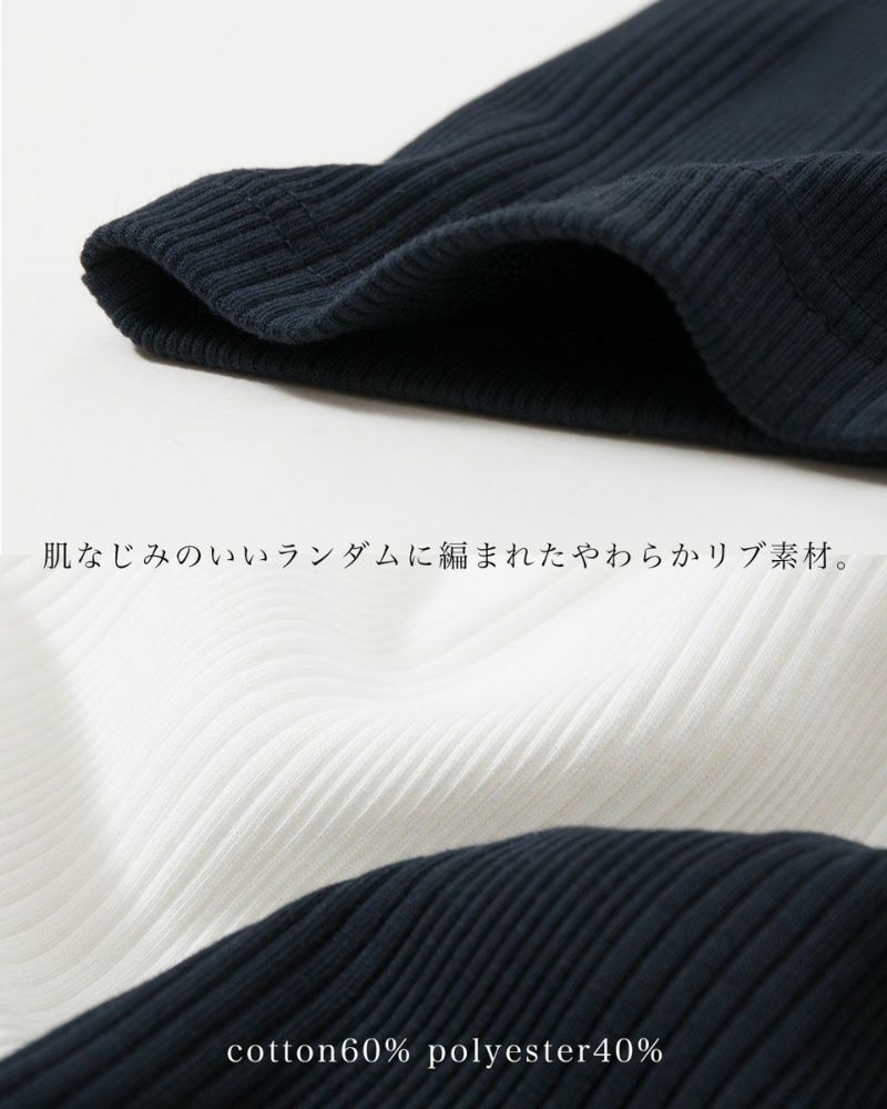 肌なじみのいいランダムに編まれたやわらかリブ素材。コットンポリエステルで夏もさらっと着れる伸縮性のある生地です。