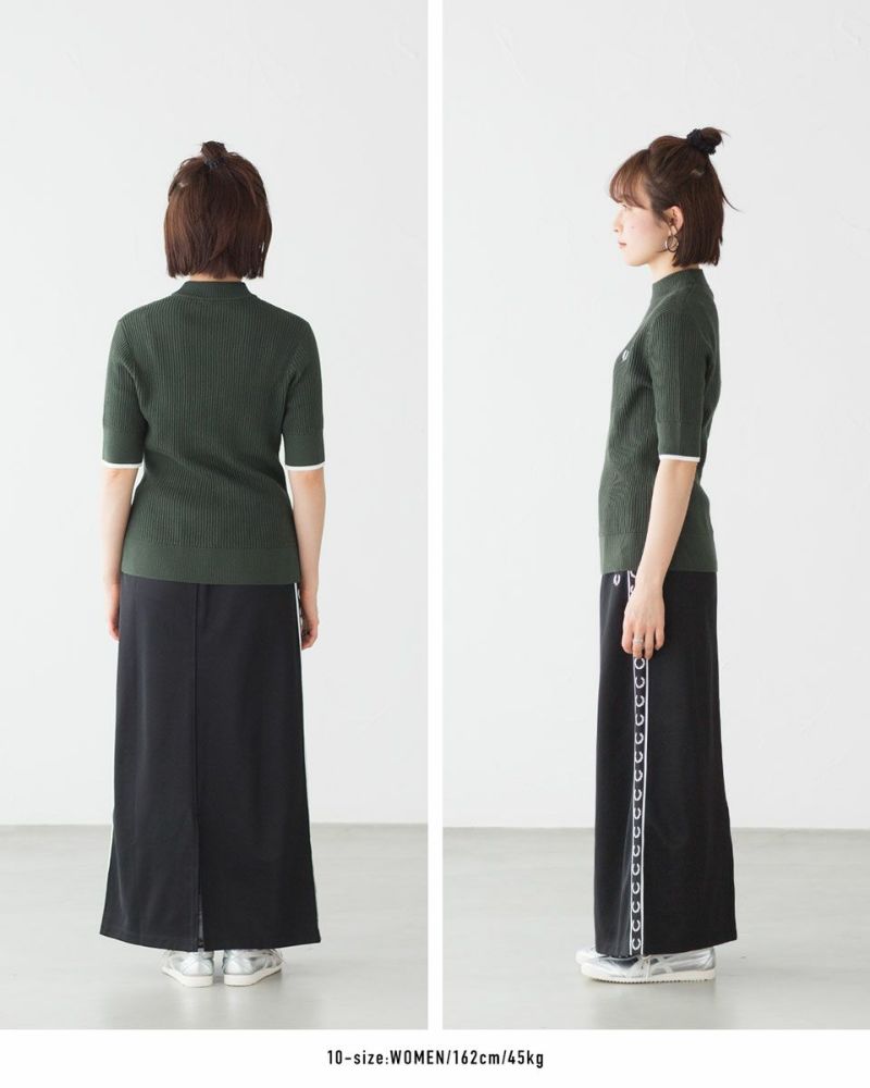 アーカイブのテニスニットからインスパイアされた編地で、ややモックネックで長めの半袖、コントラストの効いたカフのティップラインが特徴です。