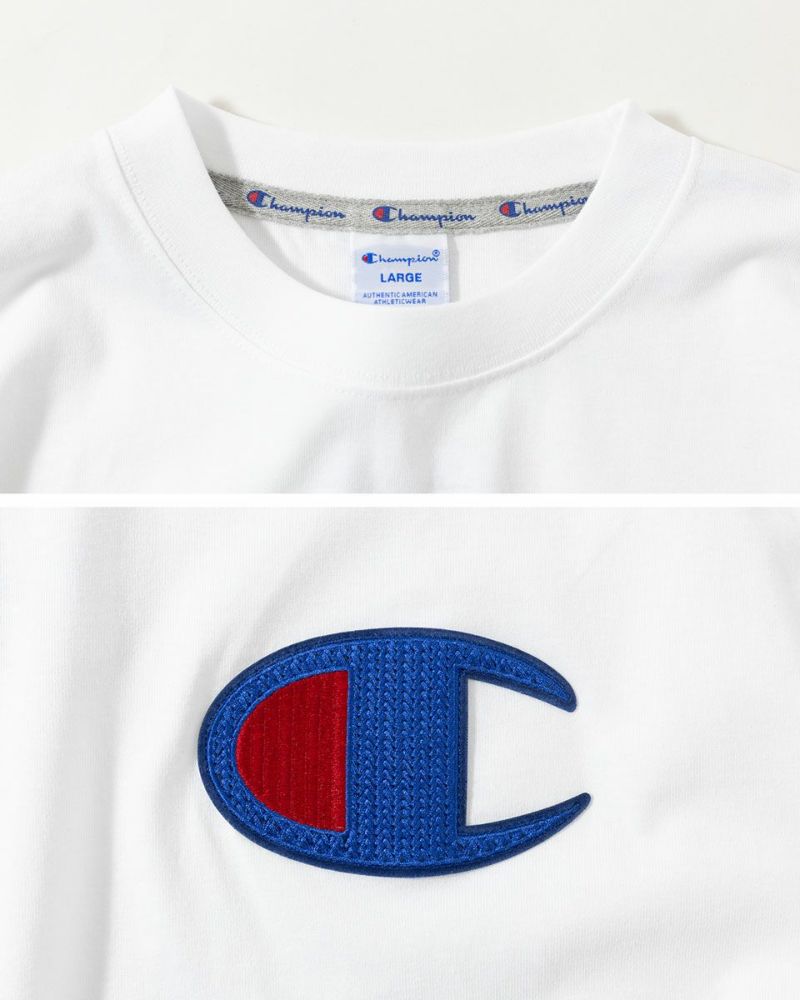 襟の内側にChampionロゴ入りのテープを貼って襟ぐりの補強を行うと同時に、デザインにアクセントを添えています。裾にはジョックタグ付き。