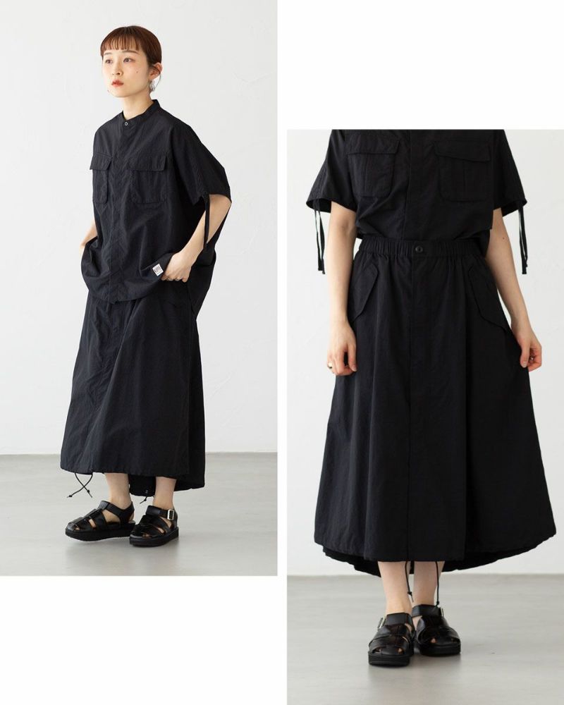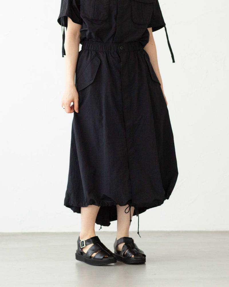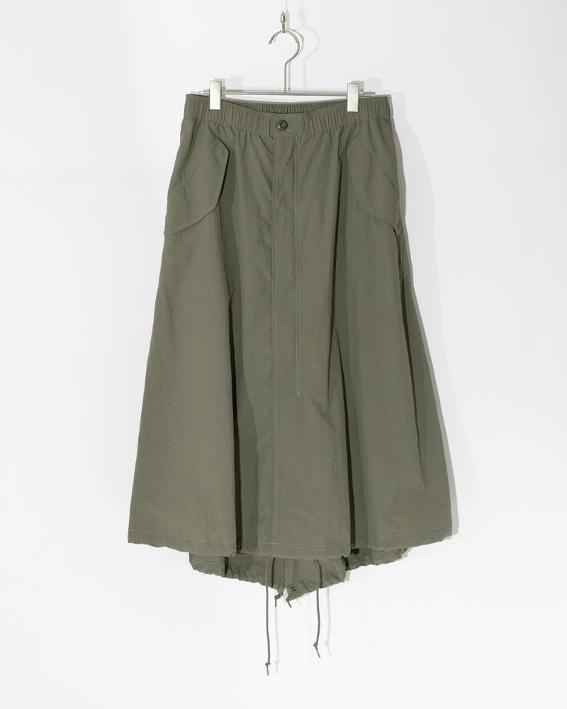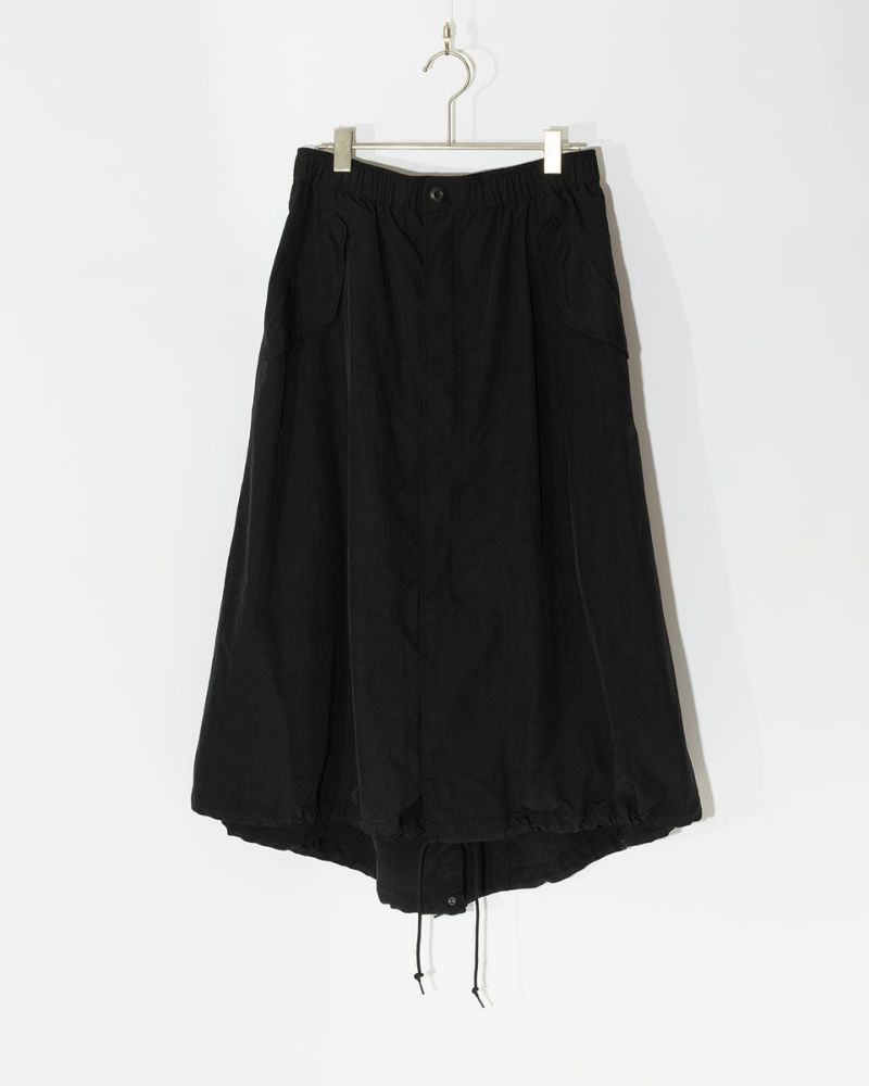 ハリ感のあるナイロン素材を使用し、立体的なシルエットに。裾はフィッシュテール仕様で、前後差のあるラインが動きにニュアンスをプラスします。