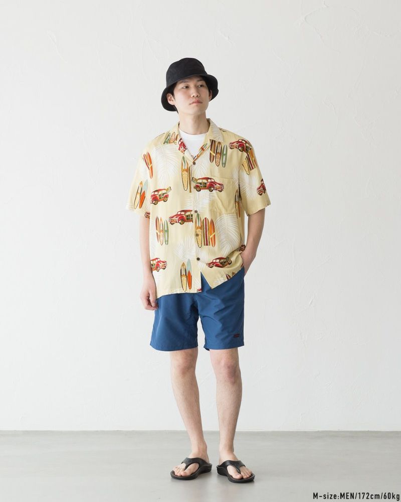 レトロなクラシックカーやサーフボードなど、南国テイストの絵柄をプリント。気ままな暮らしを思わせるリラクシーな雰囲気の一枚に仕上がっています。