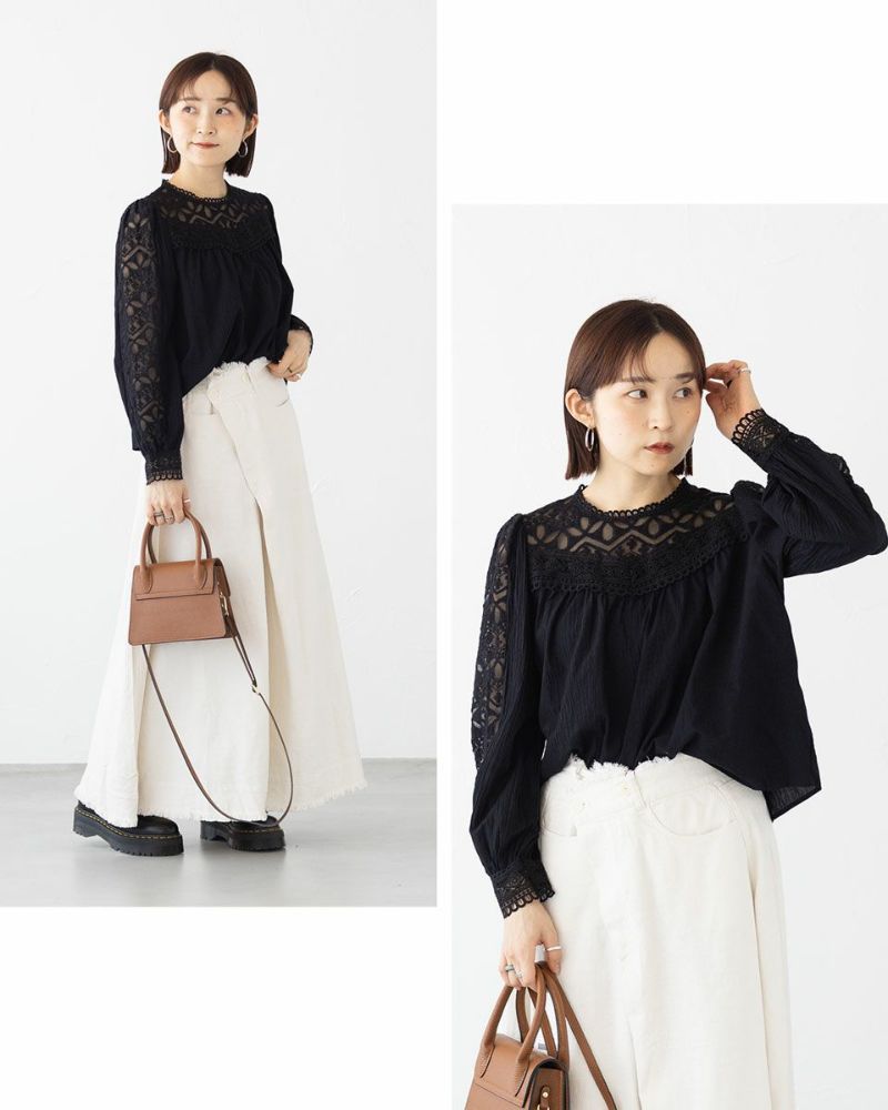 大きめな柄のシアーレースで甘くなりすぎず、カジュアル、キレイめどちらも合わせやすい絶妙なデザインに仕上がっています。