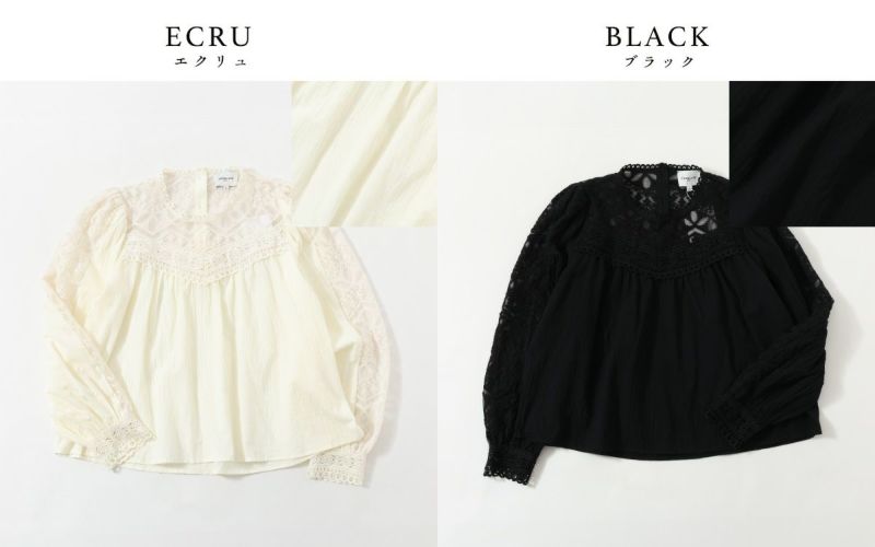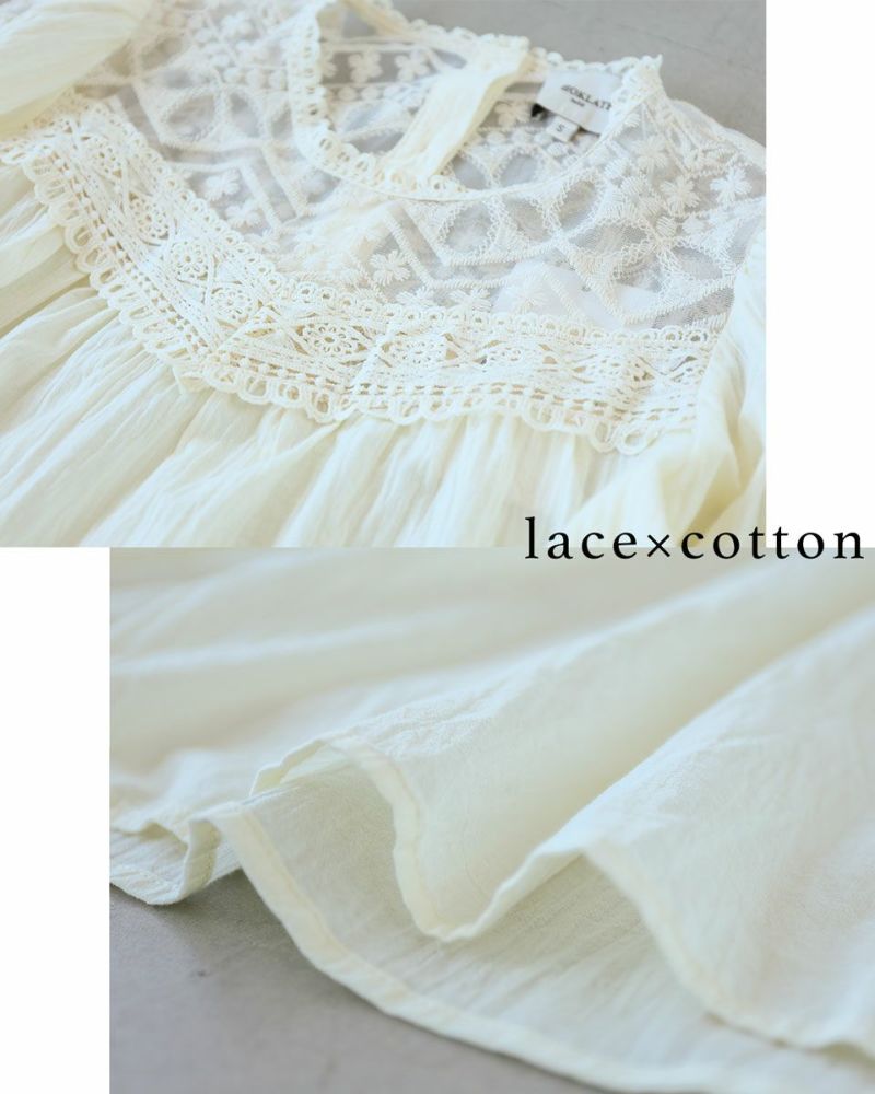 透け感のある繊細なレースが印象的なこのブラウスはコットン90%、ナイロン10%の混紡素材で仕立てられています。コットンのやわらかさと、ナイロン混紡による程よいハリと耐久性のいいとこどり素材。
