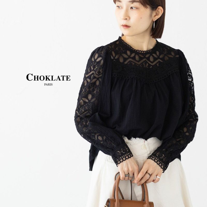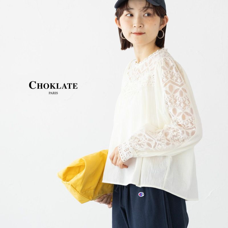 繊細なレースをあしらった「CHOKLATE PARIS / チョコレートパリ」のブラウスは、女性らしさを引き立てながらも甘さを抑えた一枚。ヨーク部分や袖に透け感のあるレースを使用し、軽やかで上品な雰囲気を演出してくれます。