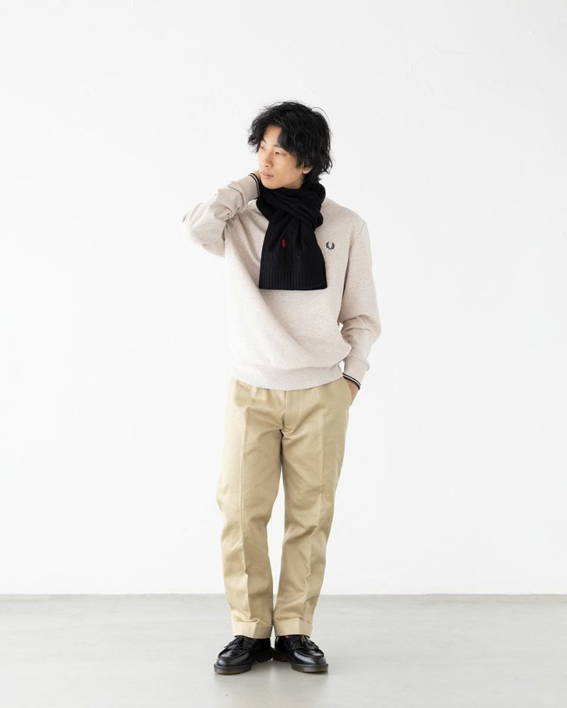 ウールナイロン混紡のニット素材。首元の防寒に十分な保温性を持ちつつも、さっと巻いてももたつかないのが嬉しいポイントです。