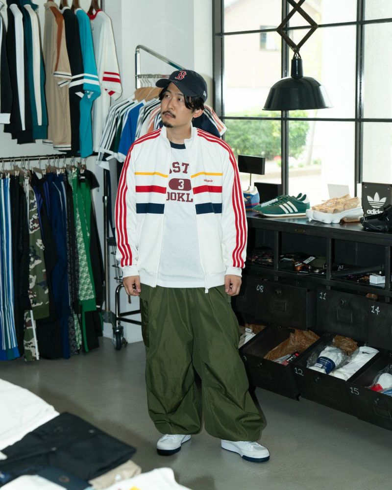 日本国旗を彷彿させる白基調のカラーリングは日常でも違和感なく着用可能、ジーンズやカーゴパンツにあわせた古着ライクな着こなしがおすすめです。