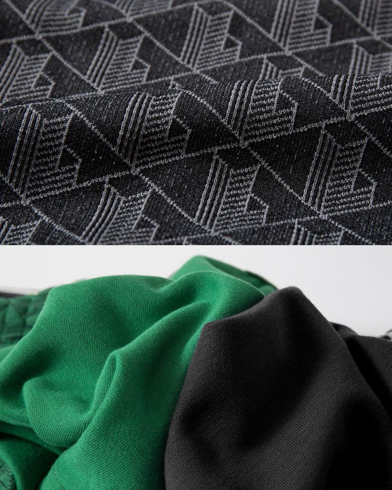 ブランドイニシャルをモチーフにした幾何学的なモノグラム柄がクール。肩から袖にかけて走らせたサイドラインのテープも存在感抜群。