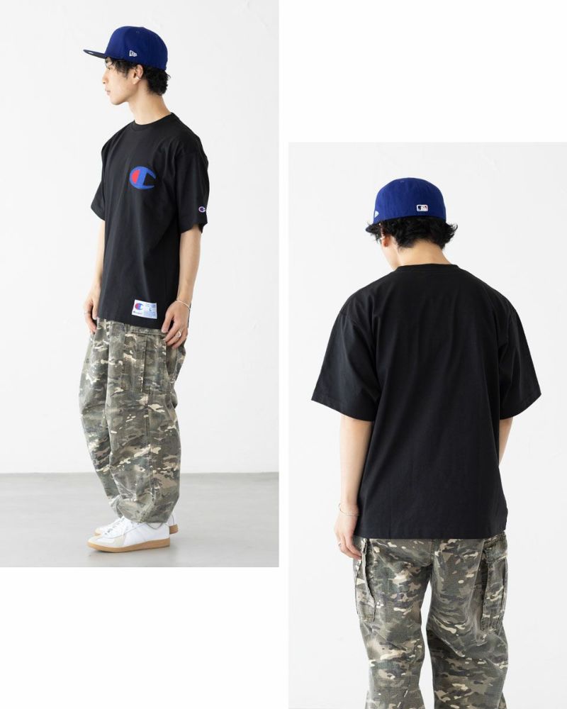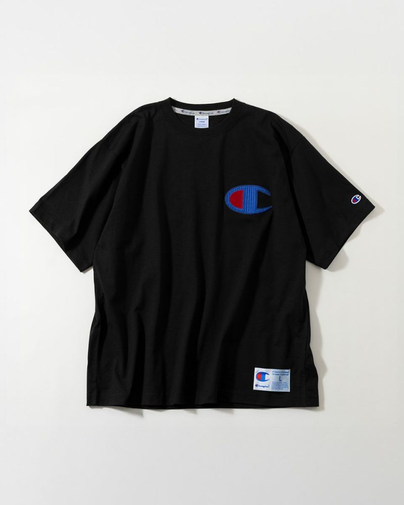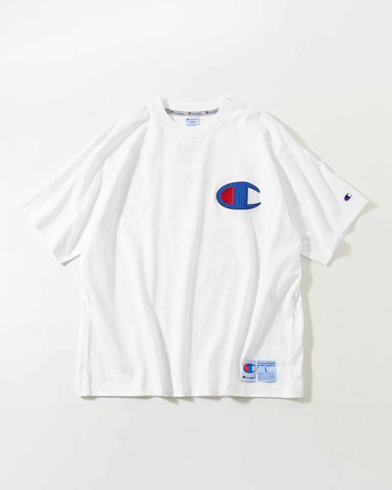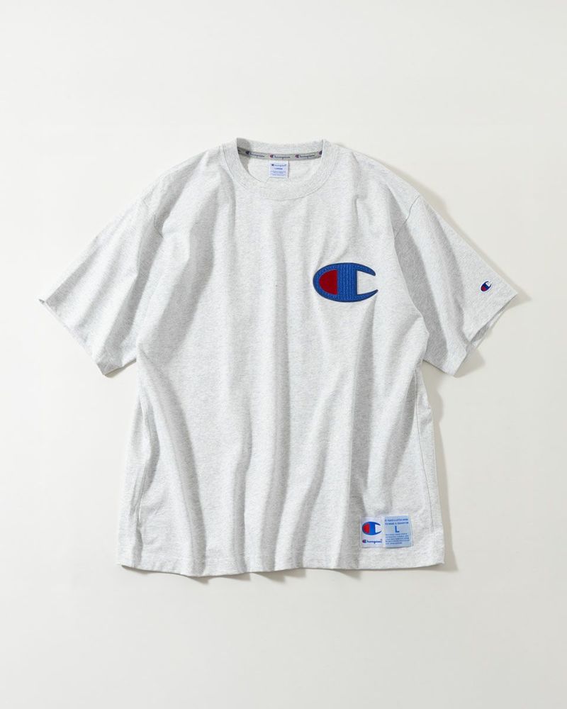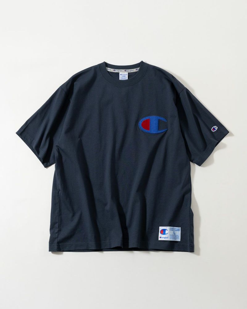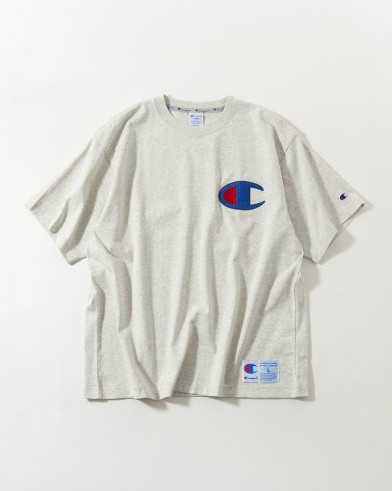 襟の内側にChampionロゴ入りのテープを貼って襟ぐりの補強を行うと同時に、デザインにアクセントを添えています。裾にはジョックタグ付き。