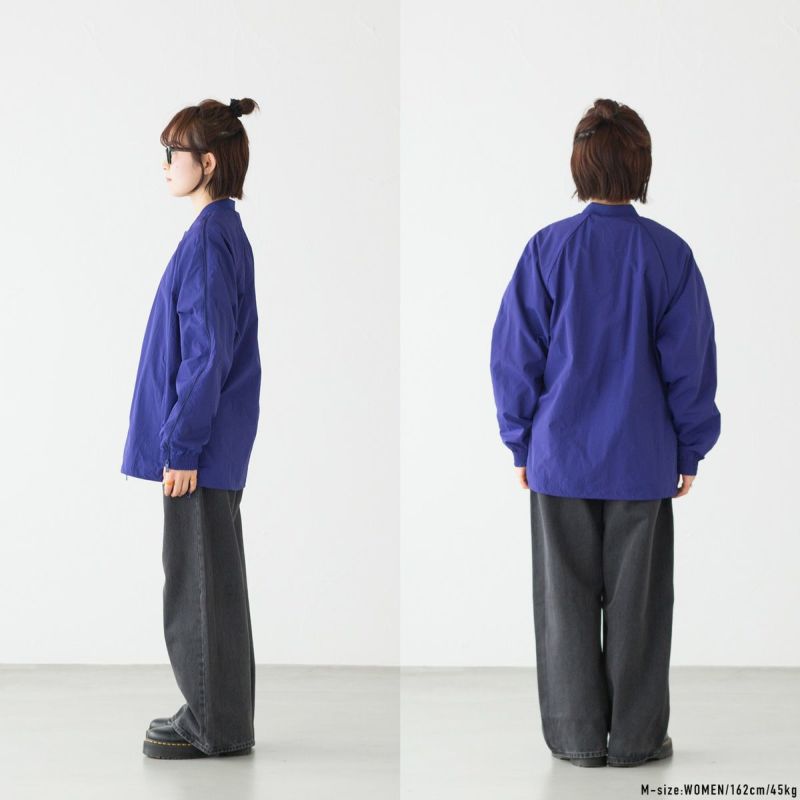艶の少ないウーブン素材で、スポーティーでありながらもファッションアイテムとして使いやすいルックスになっています。一般的なジャージ素材や編み生地に比べ花粉や埃がつきにくいというメリットも。