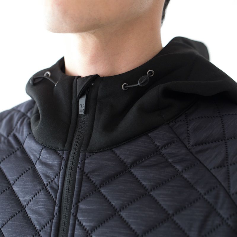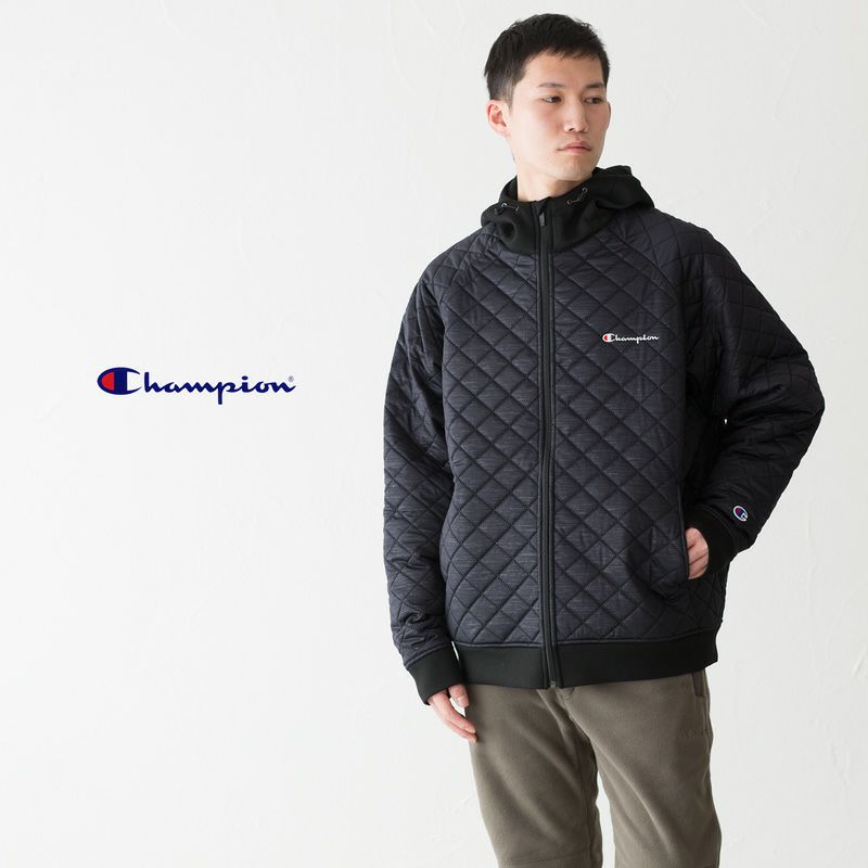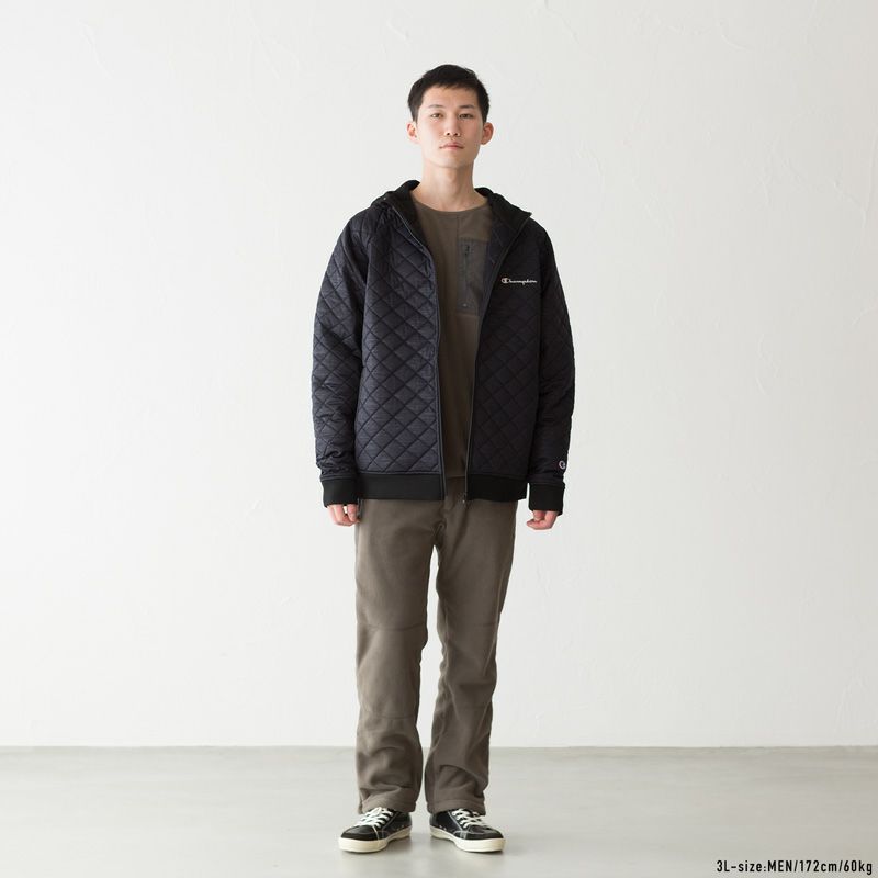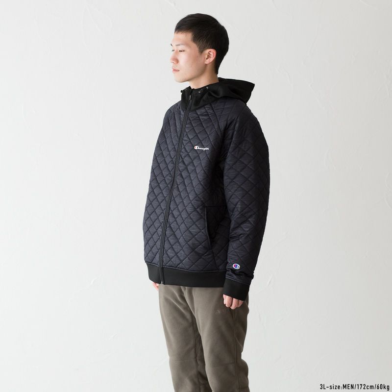 撥水性のある生地の中間層に熱圧着で中綿を入れた三層構造を持ち、保温性、撥水性、ストレッチ性、防風性を兼ね備えたジップフーデッドジャケットです。生地表面にエンボス加工することで生まれる柄のような見た目が特長です。左胸にChampion(チャンピオン)ロゴを刺繍しています。大きな3Lから5Lまでのキングサイズ展開。