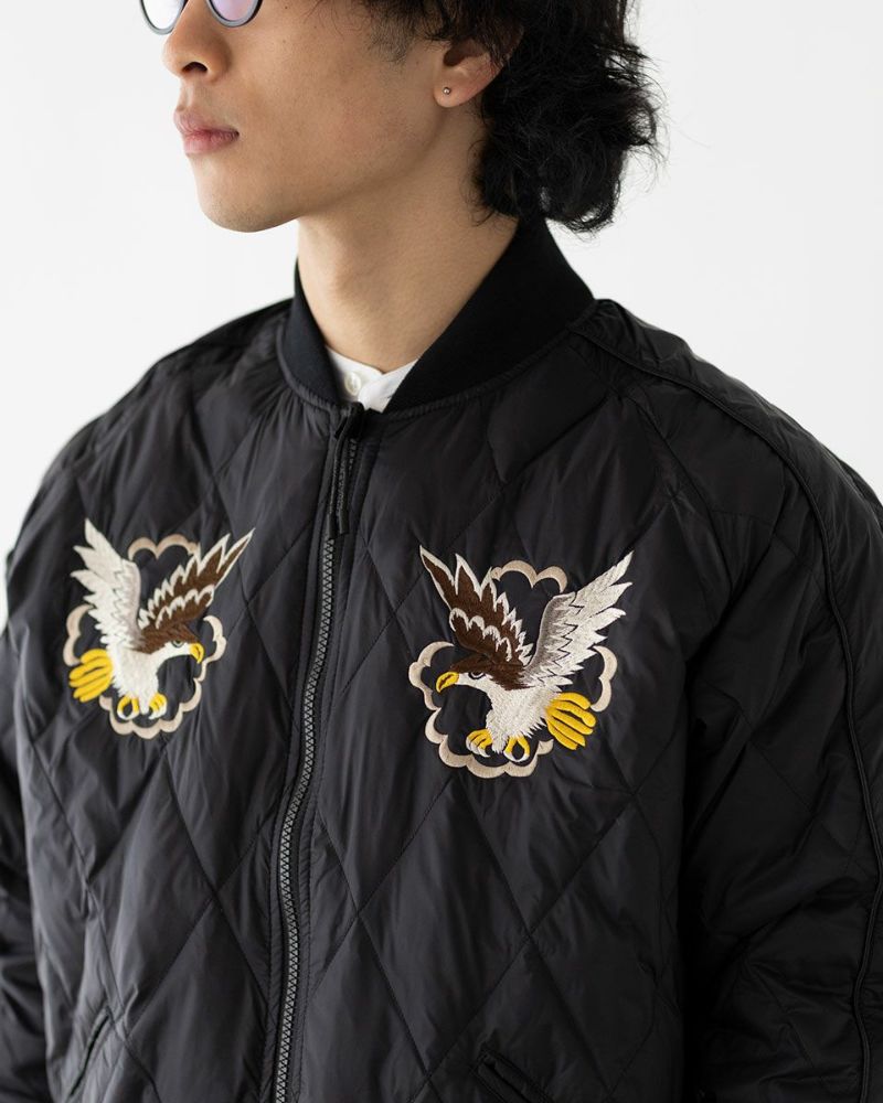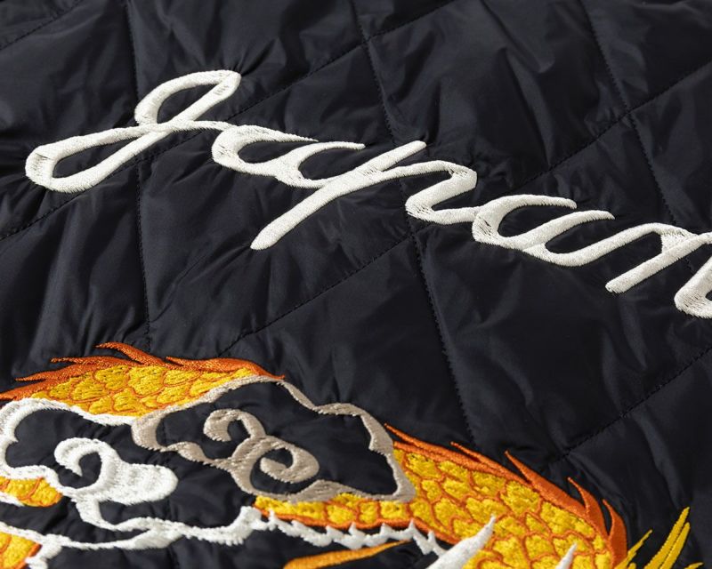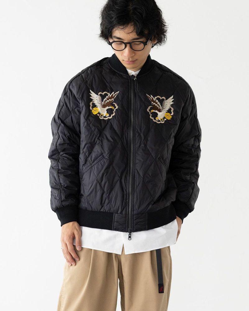 【表側】ソフトシェルのキルティングダウンにスーベニア刺繍を配した、あたたかいスカジャン仕様。