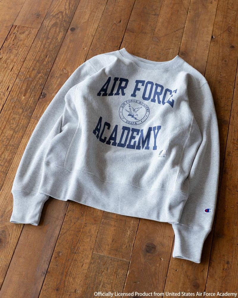 チャンピオンの代名詞リバースウィーブのスウェットシャツ。アメリカ空軍士官学校のネームとシンゴルマークがフロントを飾るスペシャルな逸品です。