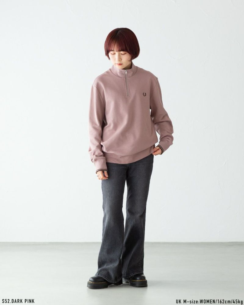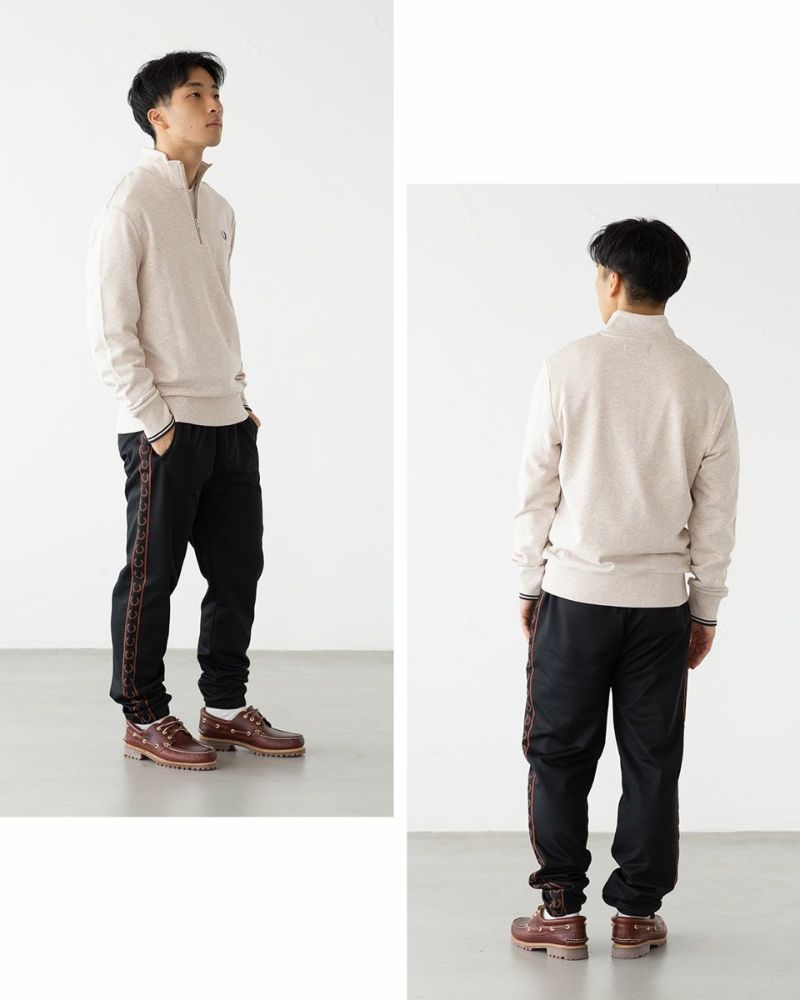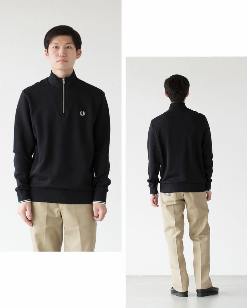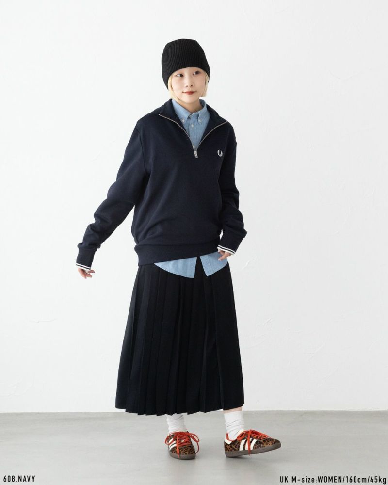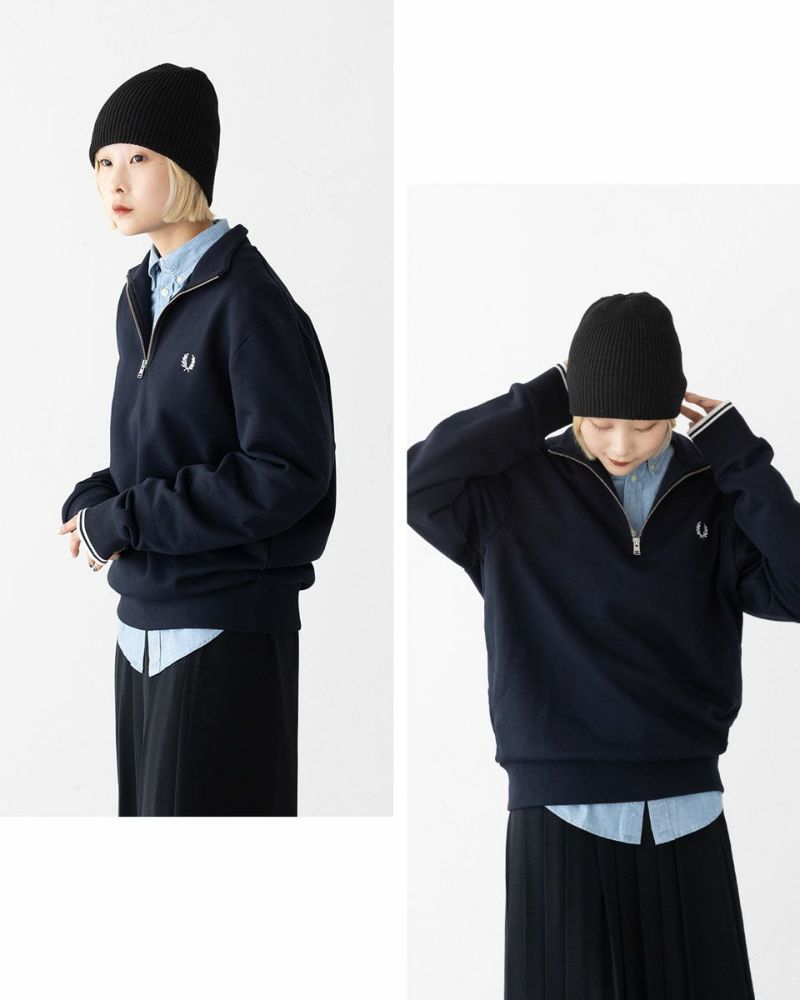 コーデのアクセントになるハーフジップは、開けて首元のレイヤードを楽しむも良し、閉じてスポーツルックを演出するも良し◎