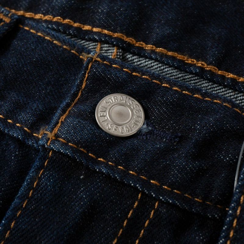ジッパーフライとややローライズな股上。一色ステッチやインターロックのアウトシームなど当時コストダウンを図ったディテールも継承しています。