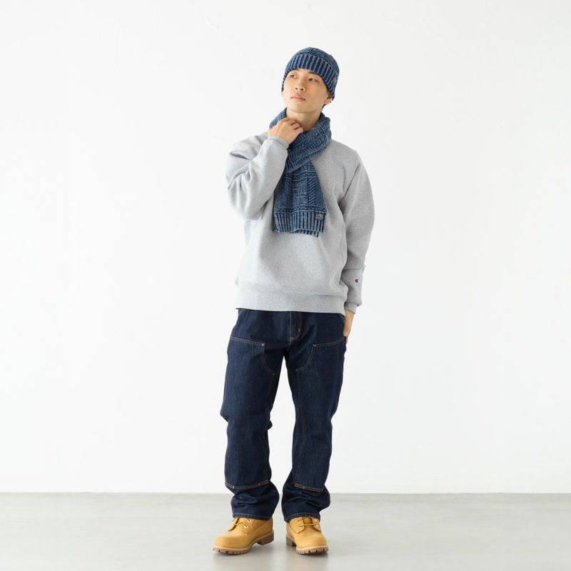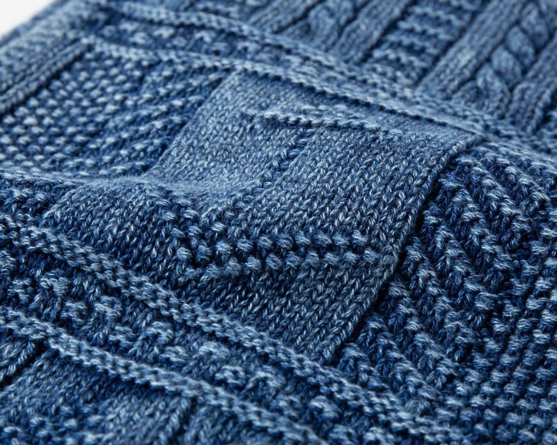 アラン編みの立体的な編み目とムラのあるインディゴがマッチして、温かみのある絶妙な質感になっています。男女問わず着けやすいデザインで、プレゼントにも最適。