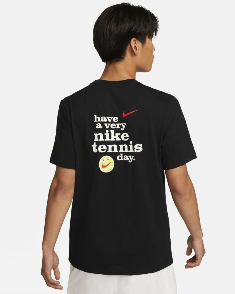 「Have a nike day」のテニスコートTシャツは、ボールに顔を描いたユーモアたっぷりの一枚。背面にもタイポグラフィーがプリントされた存在感のある仕上がりです。