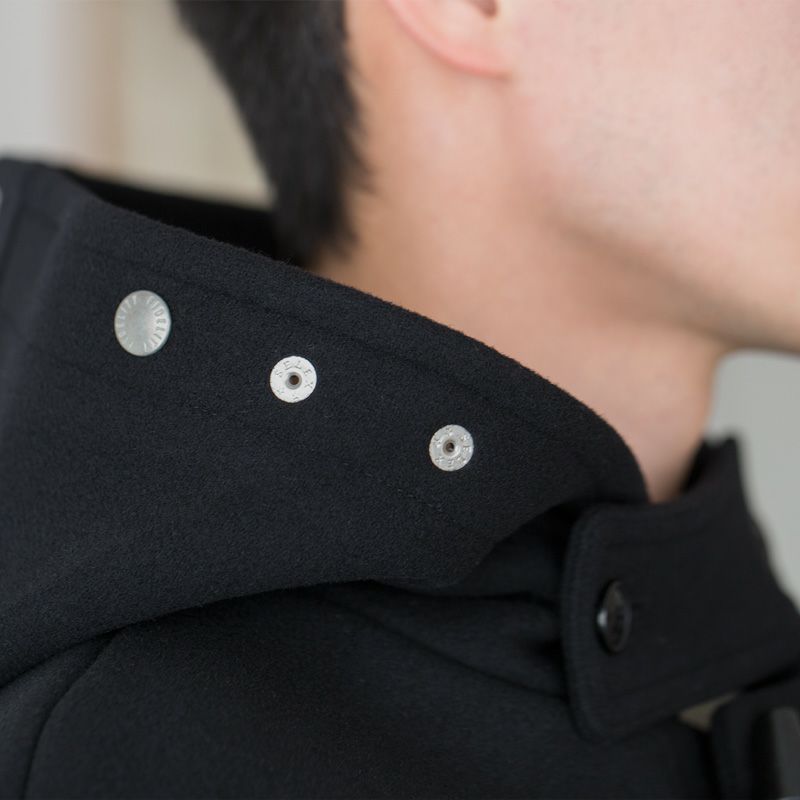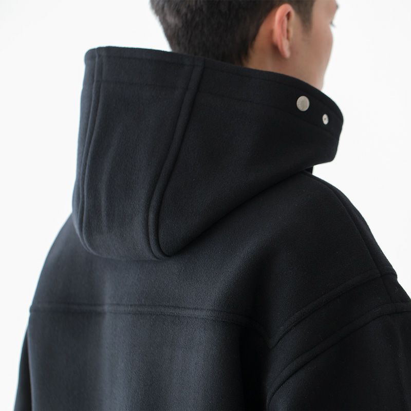 柔らかな風合いのウールメルトン生地はしっかり防寒できて快適に着続けることが可能。木製トグルや本革ループはシックなブラックで統一、フードの調整ボタンやチンストラップなど本格ディテールもしっかり備えたつくりです。